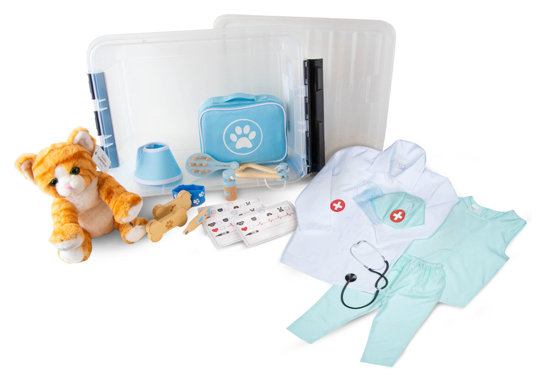12 delar. Allt en ung veterinär behöver för att vårda sjuka nallar eller dåliga djur som ska bli friska. Mått: 8,5x15x20 cm. Av FSC-märkt trä, polyester och bomull. PVC-fri. Från 3 år.