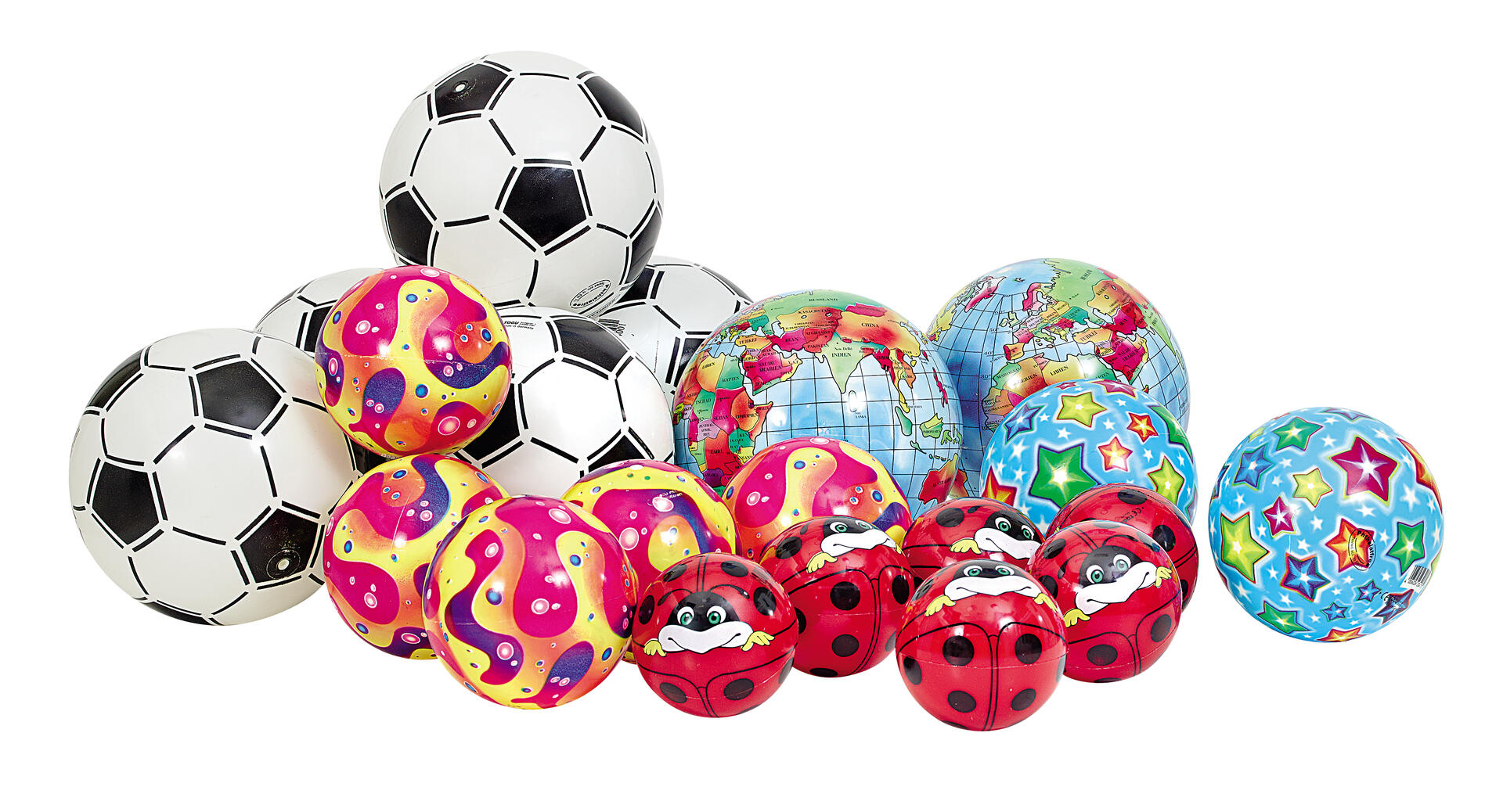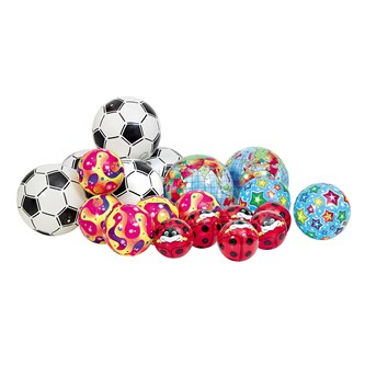 19 st/set. Ett set som innehåller 5 Nyckelpigan ø 11 cm, 5 Lekboll ø 14 cm, 2 Lekboll ø 18 cm, 2 Lekboll ø 23 cm och 5 plastfotbollar ø 21 cm. Variationer kan förekomma. Av ftalatfri PVC. Vid mindre luft, följ instruktionerna och använd alltid nippelolja vid pumpning!
