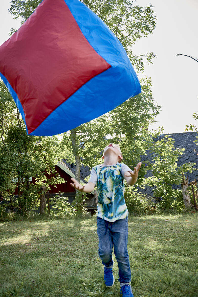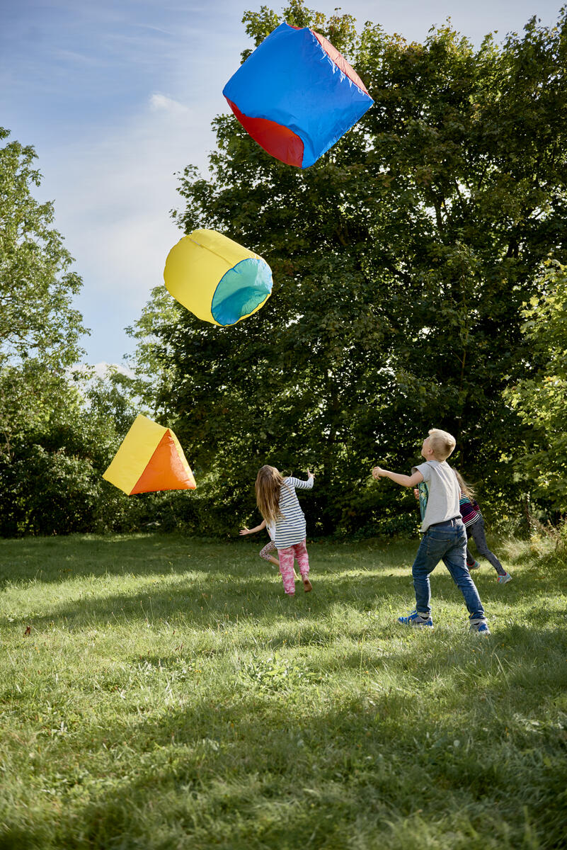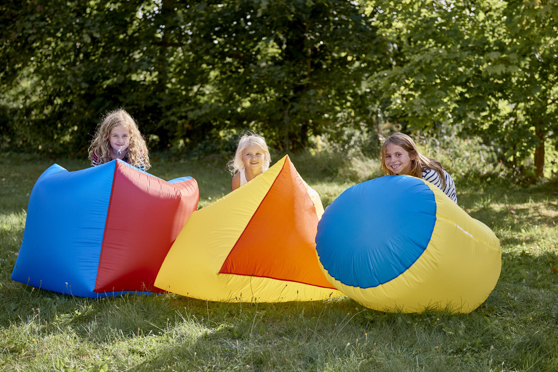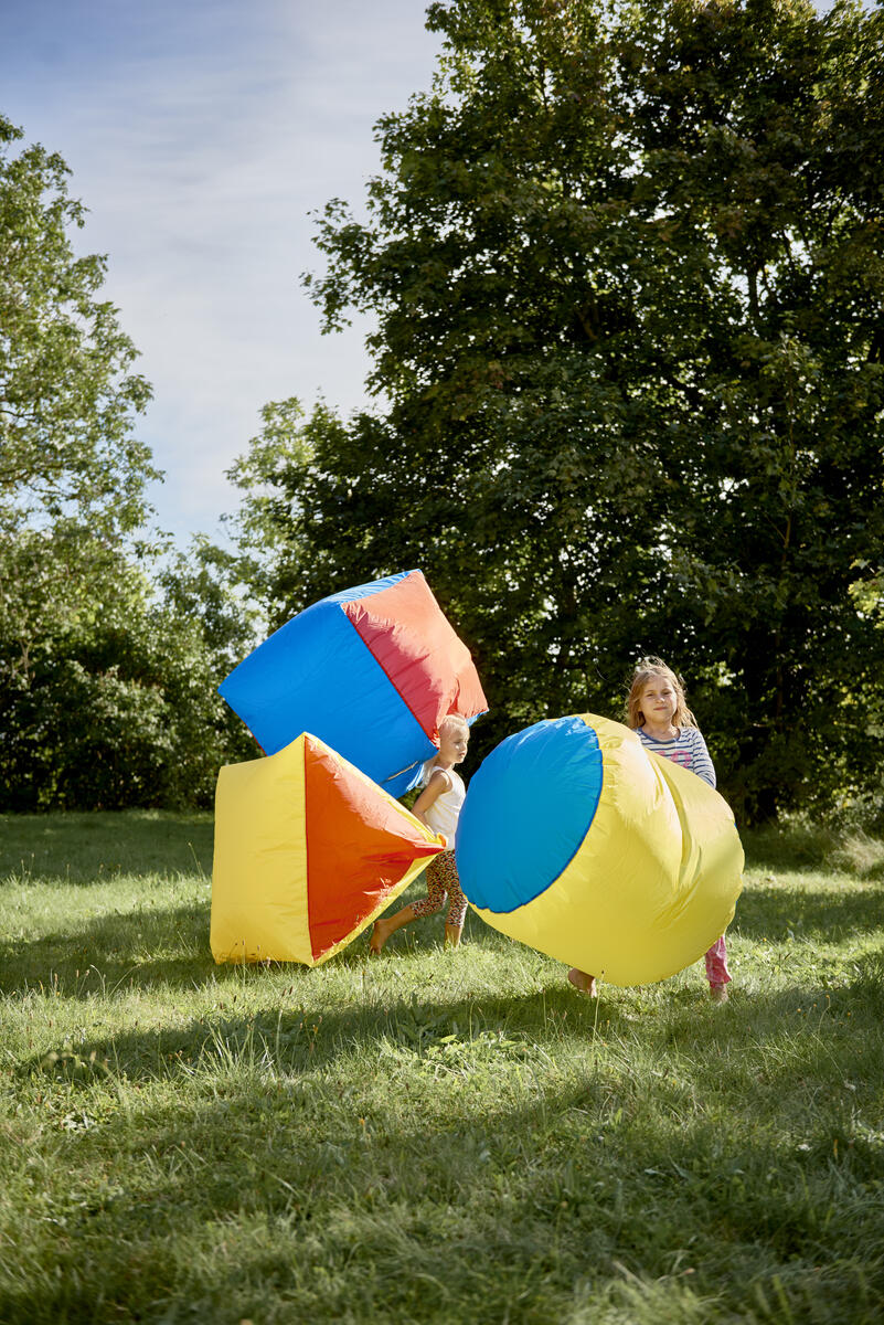 3 st/fp. Setet innehåller 3 fjäderlätta former som bokstavligen flyger i luften. Innehåller formerna kub, cylinder och pyramid. Passar bra för användning både inom- och utomhus. Formerna rör sig i ett lugnare tempo som gör det lättare för alla att vara med. Används t.ex. vid samarbetsövningar och kasta- och fångaaktiviteter, både med och utan nät. Då svävbollarna inte har någon innerblåsa rekommenderar vi en pump som har hög kapacitet, förslagsvis 71996, eller en lövblåsare. Det tar då ca 5 min för att blåsa upp alla 3. Med vanlig pump tar det ca 15-20 minuter. Mått: 0,91 cm. Av nylon och polyester. PVC-fri.