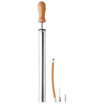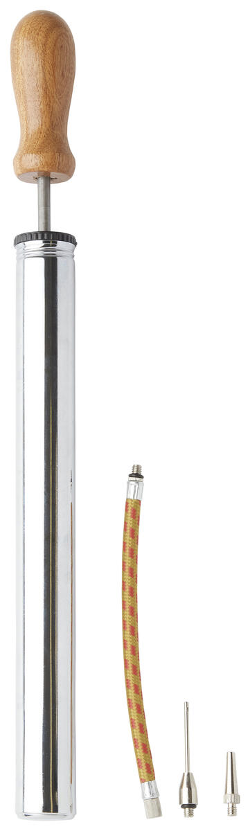 En kraftfull bollpump av metall för bland annat fotbollar, handtag av trä. Medföljer två nipplar i metall som antingen fästs direkt på pumpen eller på medföljande slang av polyester. Mått på pump 37 cm, mått på slang 16 cm.