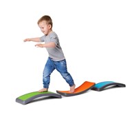 7 delar. Balansplattor som kan sättas ihop till en mängd olika motorikbanor. 6 färger. 6 av delarna har måtten 35,5x11,5 cm, och 1 del är 15,5x8,5 cm. Alla delar är 4,5 cm höga. Av plast med glidsäkra gummikanter. Stapelbara för enkel förvaring. Av PP och TPE. Från 2 år.