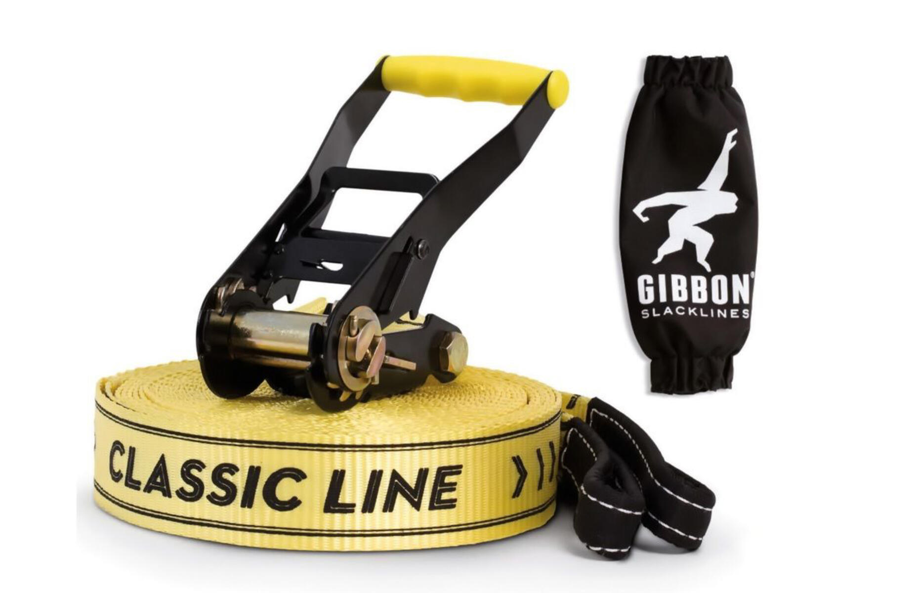 Lätt att gå på då den inte är så elastisk. Detta gör även att den går att montera närmare marken, vilket gör den säkrare för barn att använda. Gummerat grepp gör det lättare att hålla fötterna kvar på linan. Innehåll: slackline 12,5 m med ögla, slinga 2,5 m med ögla, 2 trädskydd 1 m, spännanordning med säkerhetslås, fodral till spännanordning, bruksanvisning, monteringsanvisning och komigångguide. Brottstyrka 40 kN. Vikt 3 kg. Bredd: 5 cm. Maxvikt 150 kg. Av polyester och stål.