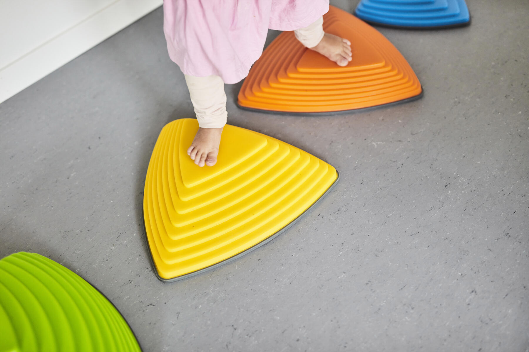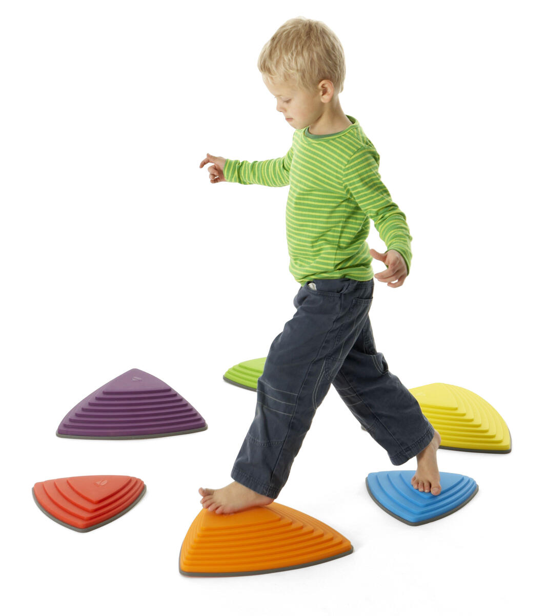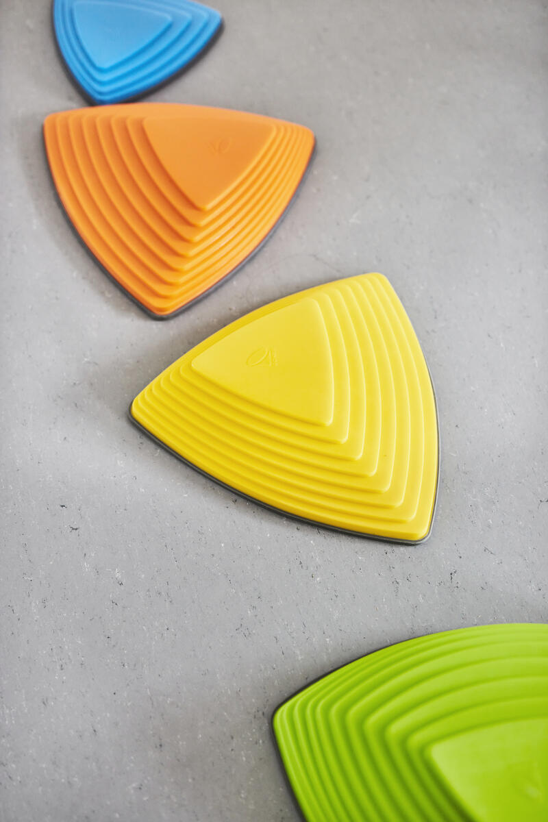 Tränar barnens koordination, balans och förmåga att bedöma avstånd. Stenarna är triangulära och har gummifötter. Innehåller 3 stenar i storlek 25x25x25 cm, höjd 4,5 cm samt 3 st i storlek 36x36x36 cm, höjd 8,5 cm. Staplingsbara för att ta mindre plats när de inte används. Kan användas såväl ute som inne, men förvaras inomhus. Av PP och TPE. PVC-fri. Från 2 år.