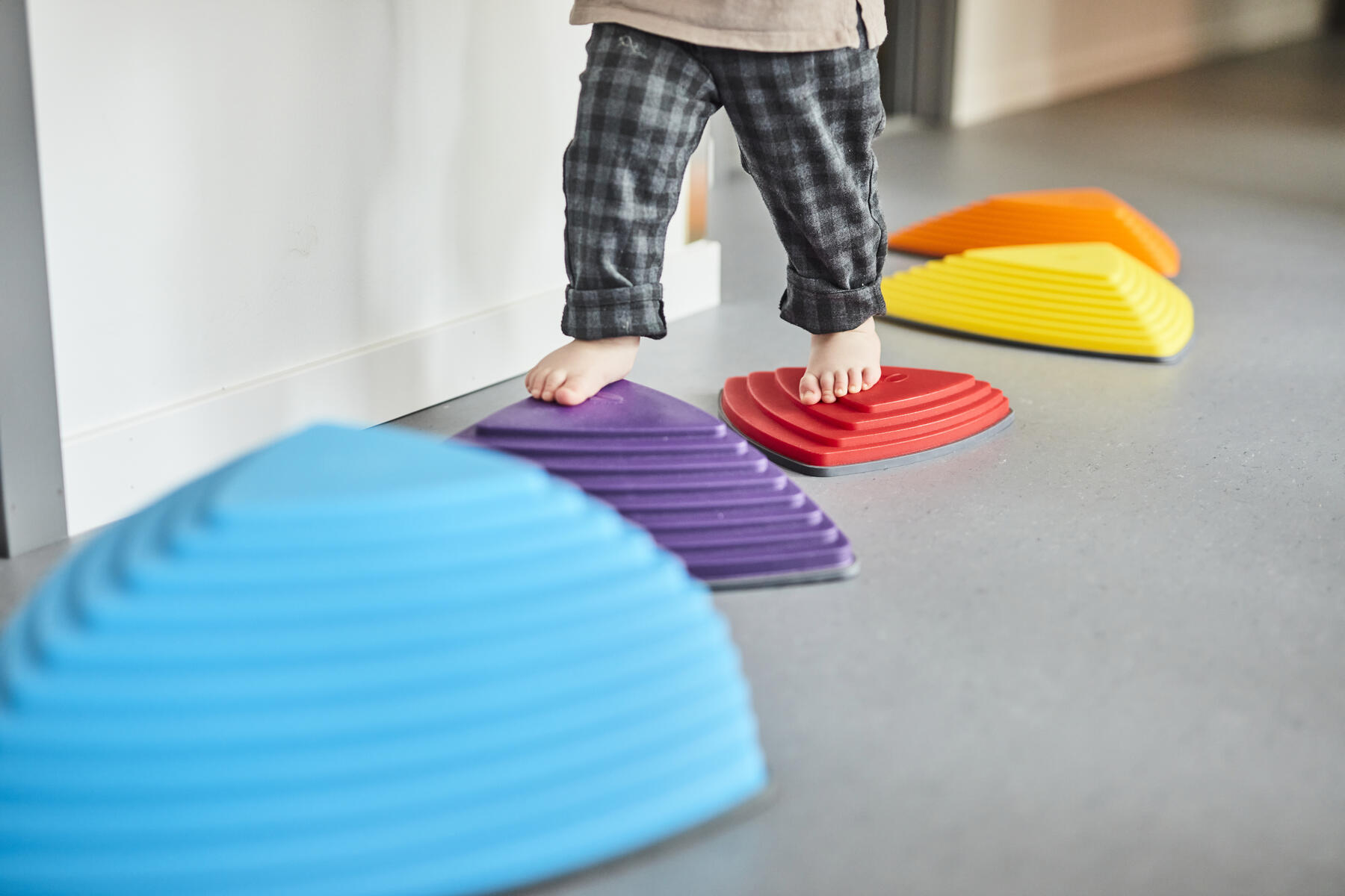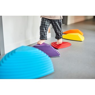 7 delar. Balansplattor som kan sättas ihop till en mängd olika motorikbanor. 6 olika färger. 6 av delarna har måtten 35,5x11,5 cm, och 1 del är 15,5x8,5 cm. Alla delar är 4,5 cm höga. Av plast med glidsäkra gummikanter. Stapelbara för enkel förvaring. Av PP och TPE. PVC-fri. Från 2 år.