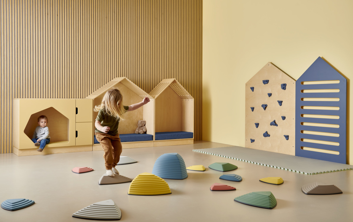 5 bergskullar i olika höjder: 8,5 cm, 17 cm och 23,5 cm. De höga topparna gör barnen förtroliga med höjder samtidigt som deras motorik tränas. Alla toppar är försedda med gummifötter som hindrar dem från att glida samtidigt som man skyddar golvet. Av PP och TPE. PVC-fri. Från 2 år.