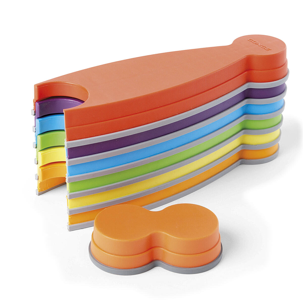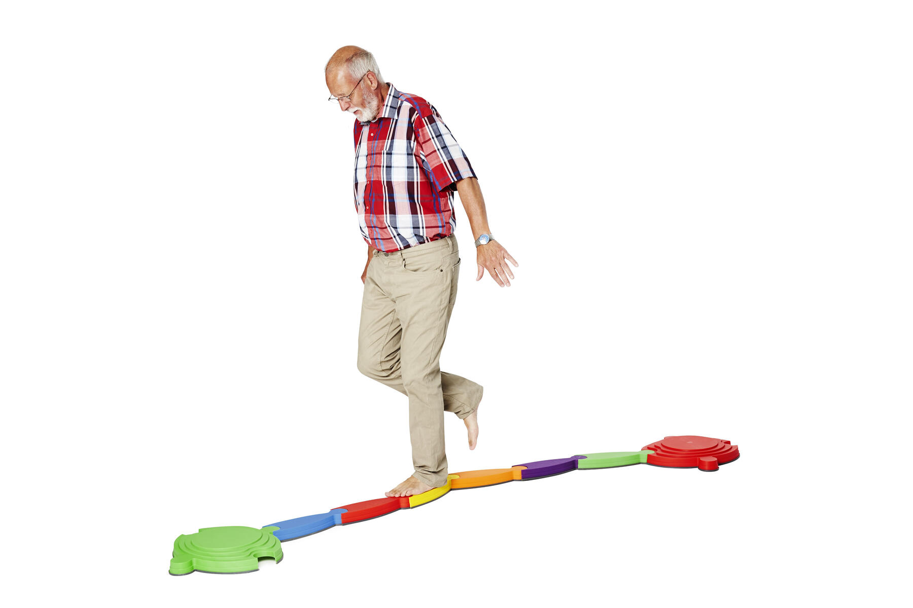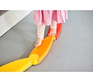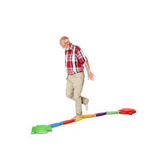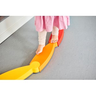 7 delar. Balansplattor som kan sättas ihop till en mängd olika motorikbanor. 6 olika färger. 6 av delarna har måtten 35,5x11,5 cm, och 1 del är 15,5x8,5 cm. Alla delar är 4,5 cm höga. Av plast med glidsäkra gummikanter. Stapelbara för enkel förvaring. Av PP och TPE. PVC-fri. Från 2 år.