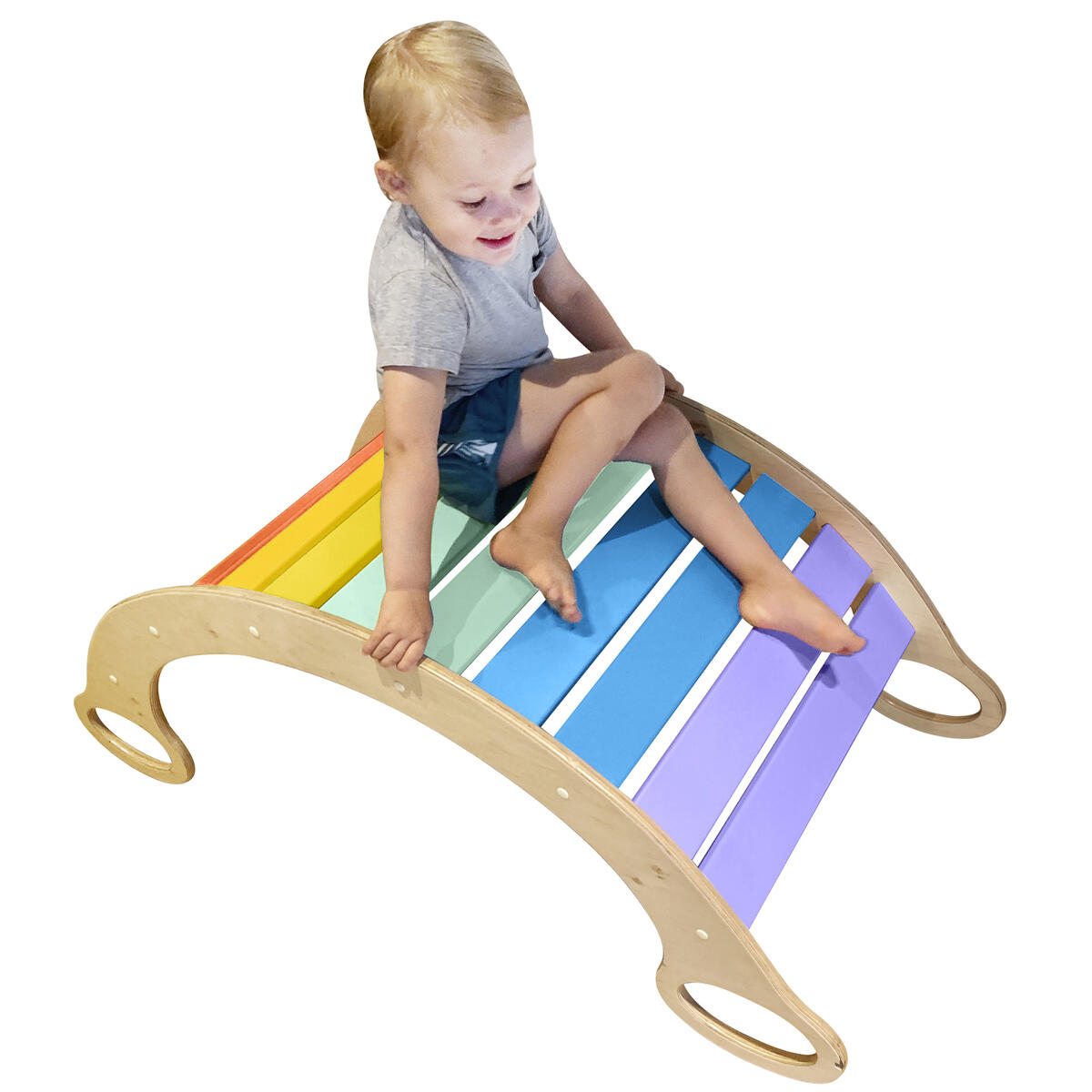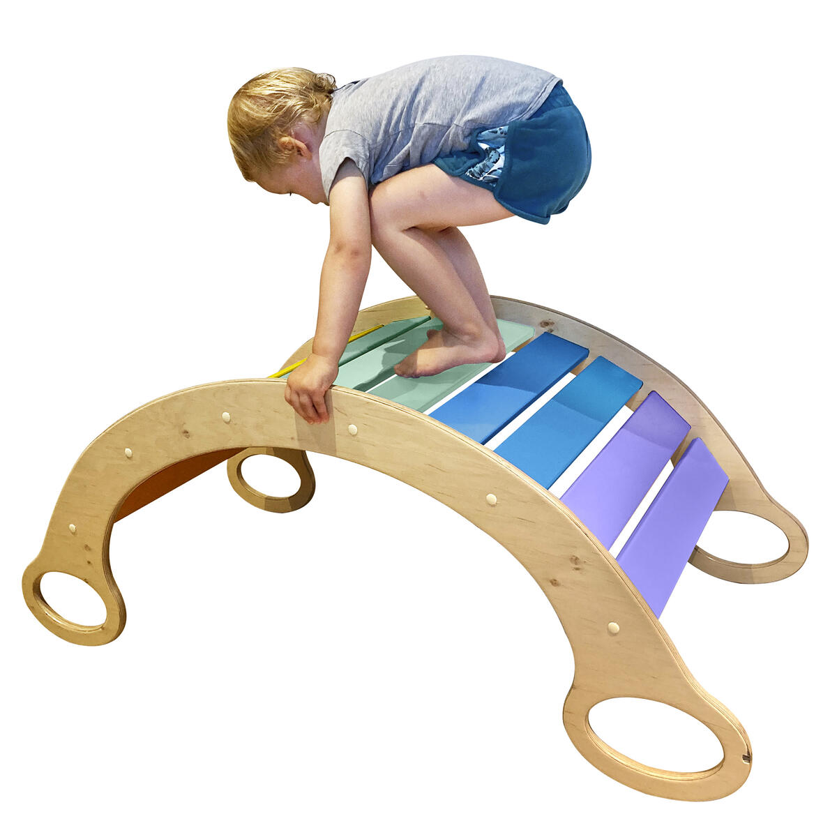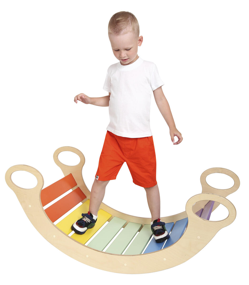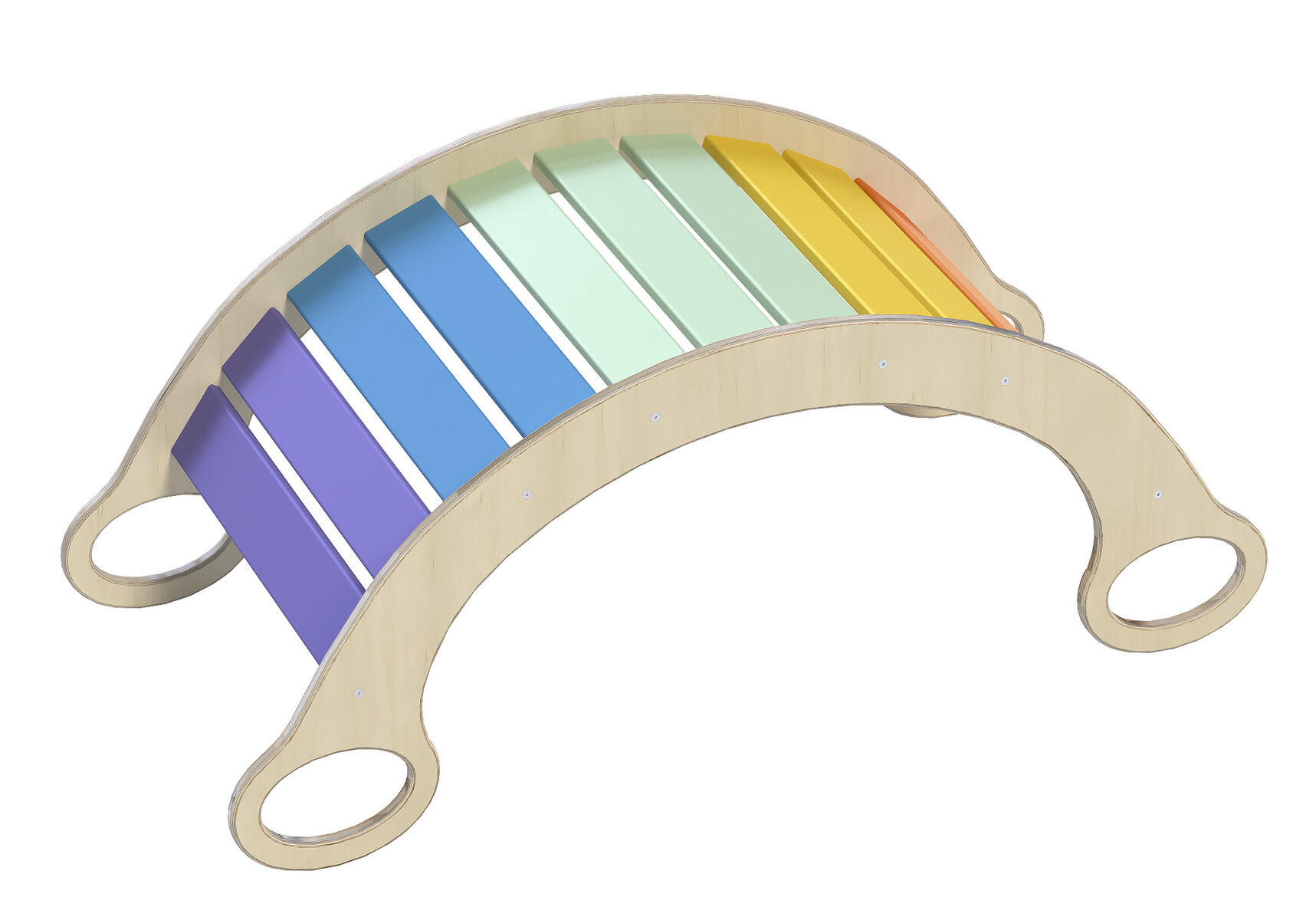 Här kan barnen bygga sin egen koja eller tunnel, eller vända på valvet och ha det som en gunga. Innehåller 5 st lekvalv med regnbågens färger av trä med stomme i stål.