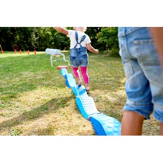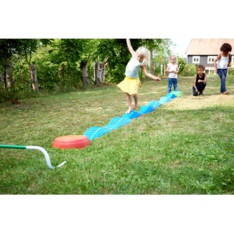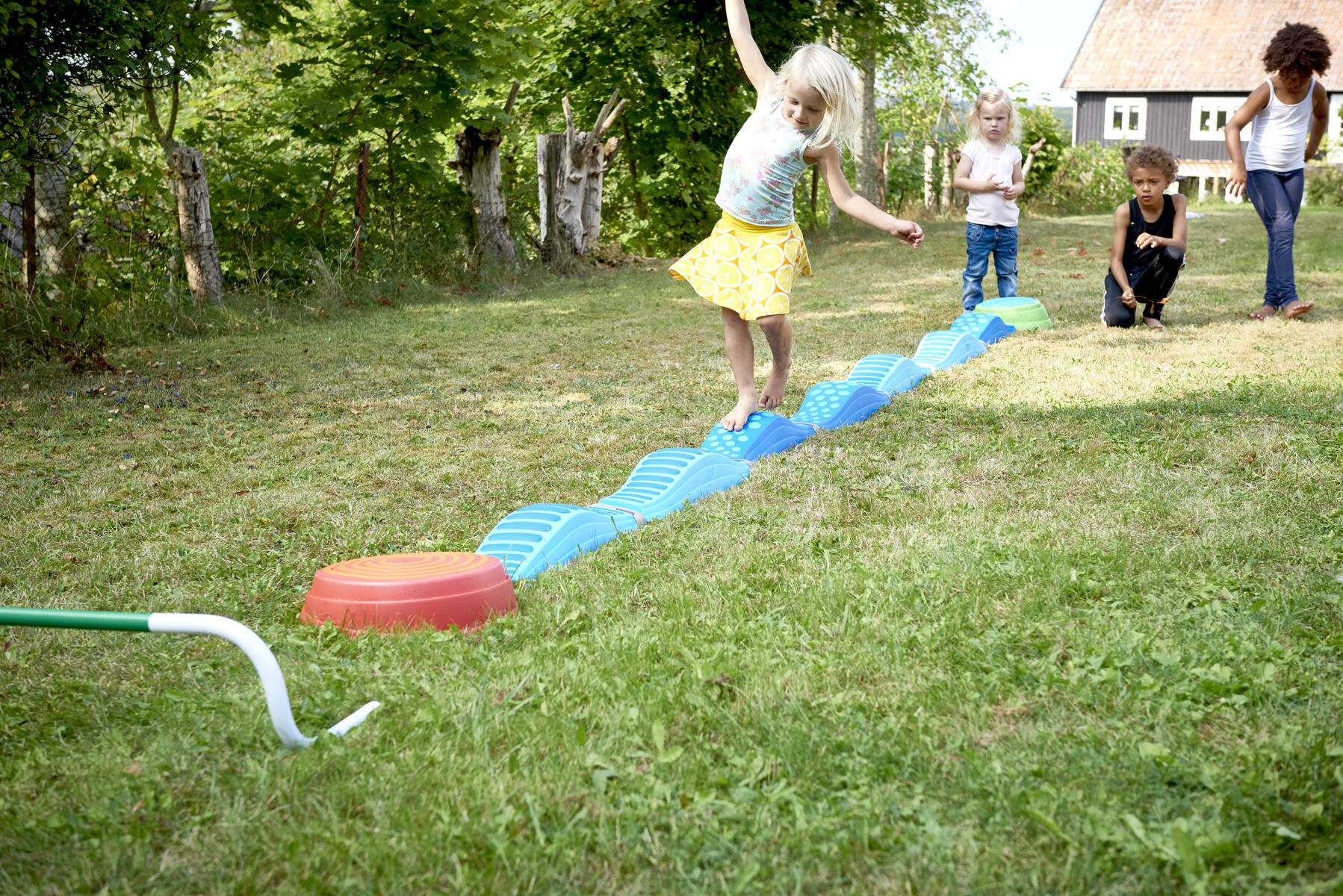 12 st/fp. 6 st stenar och 6 st stockar som är sammankopplade med ett justerbart rep. Antiglid för att stå stabilt. Avståndet kan justeras så att barnen utvecklar sin balans successivt. Mått på sten: topp ø 23, botten ø 32 och höjd 13 cm. Mått på stock: L50xB14 cm. Av PP. PVC-fri. Från 3 år.