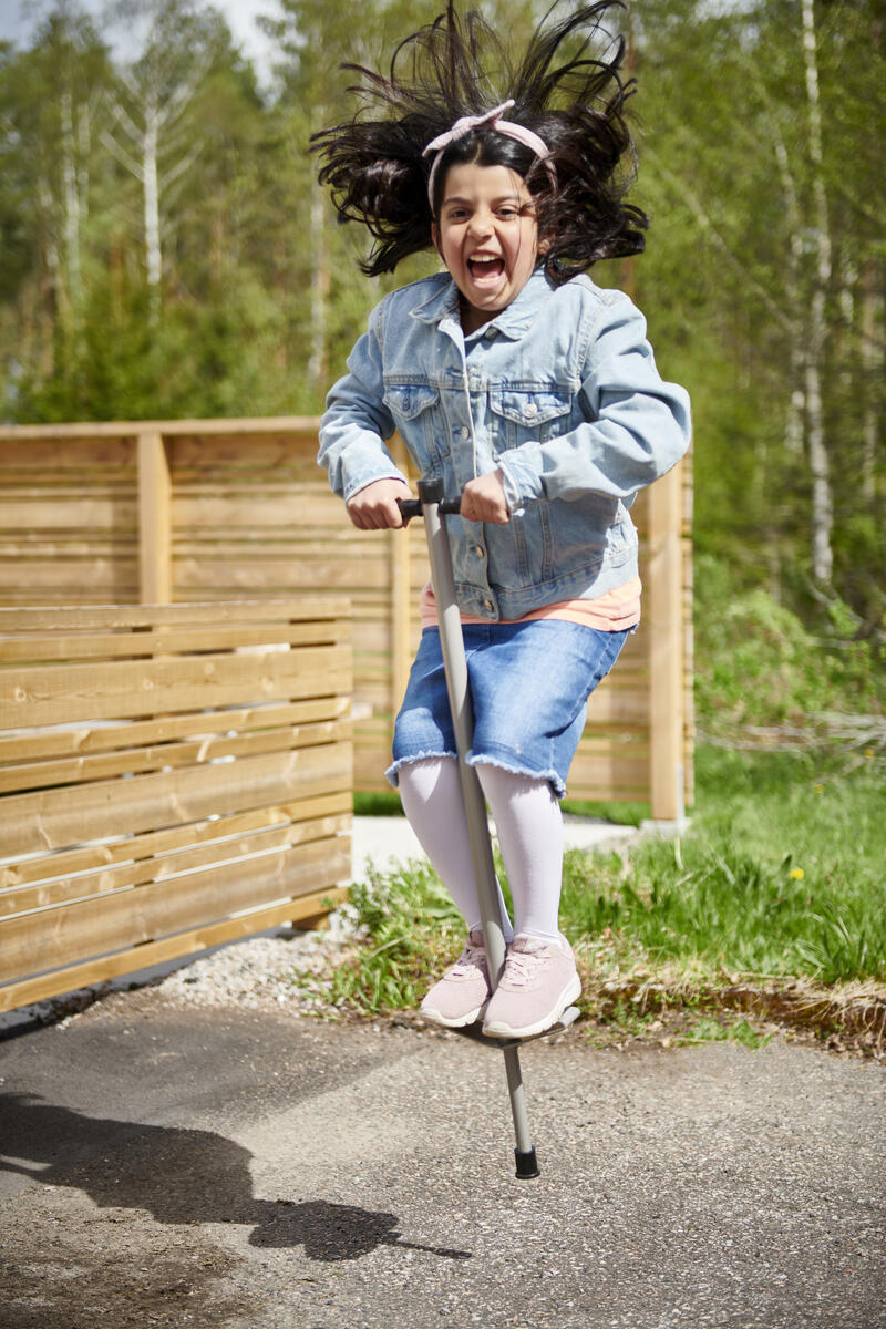 Klassisk hoppstylta i hög kvalitet. Använd på plant, halkfritt, hårt och torrt underlag. 22 mm stålrör med kraftig fjäder. Handtag av PE, fot av gummi. Mått: totallängd 91 cm, avstånd mellan handtag och fotplatta 68 cm. Rekommenderad vikt: 30-60 kg. PVC-fri. Från 7 år.