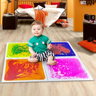 6 st/fp. Fascinerande golvplattor med olikfärgade vätskor som rör sig när man trycker på plattan. Plattorna har dessutom olika struktur eller mönster vilket gör att de känns olika när man går på dem eller känner på dem med händerna. Det går även att rulla med en rullstol över för att få vätskan att röra på sig. Maxvikt 120 kg. Mått: 30x30 cm. Från 3 år.