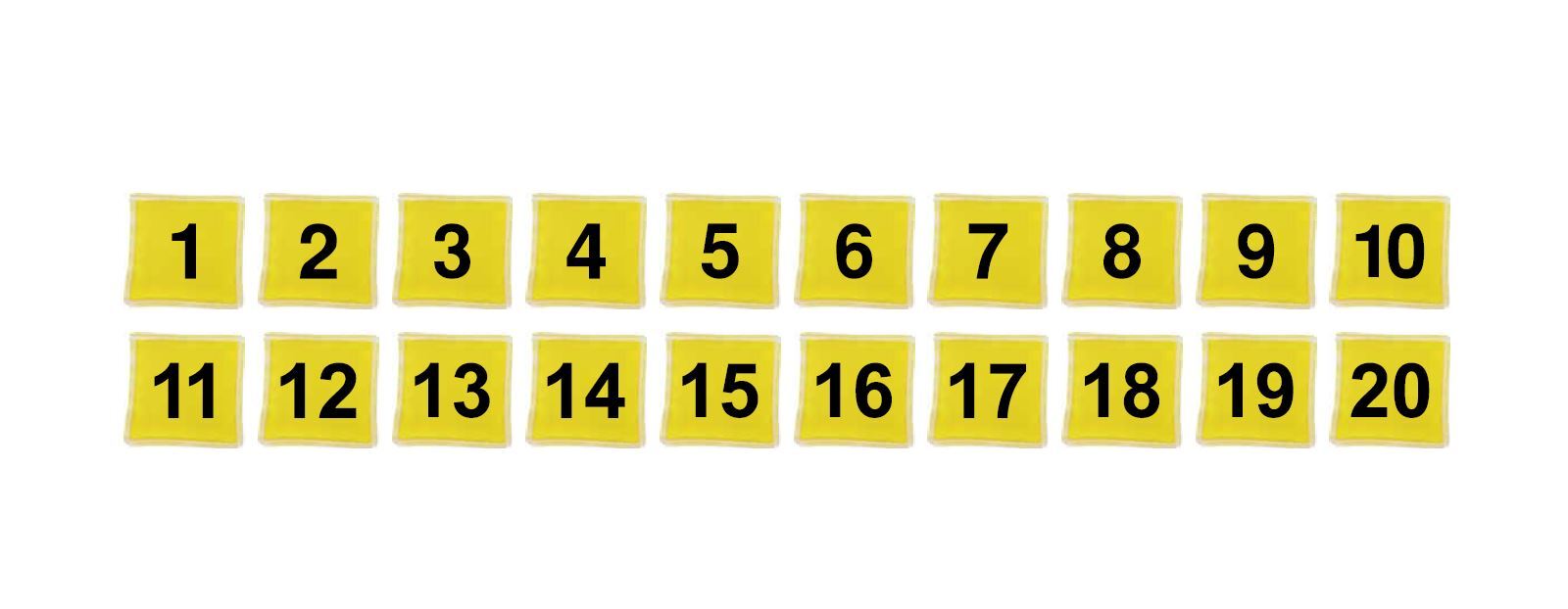 20 st/fp. Färgglada ärtpåsar med tryckta siffror 1-20. Erbjuder många möjligheter för lek och lärande. Kan användas både inom- och utomhus. Av nylon, fyllda med plastpellets av polypropen. Mått: 10x10 cm. PVC-fri. Från 3 år.