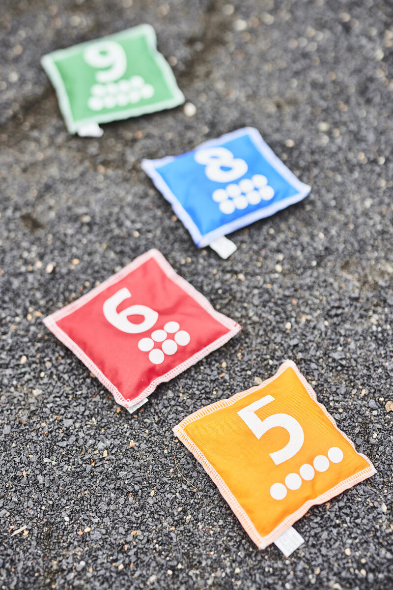 10 st/fp. Färgglada ärtpåsar med tryckta siffror och prickar 1-10. Erbjuder många möjligheter för lek och lärande. Kan användas både inom- och utomhus. Av nylon, fyllda med plastpellets av polypropen. Mått 10x10 cm. PVC-fri. Från 3 år.
