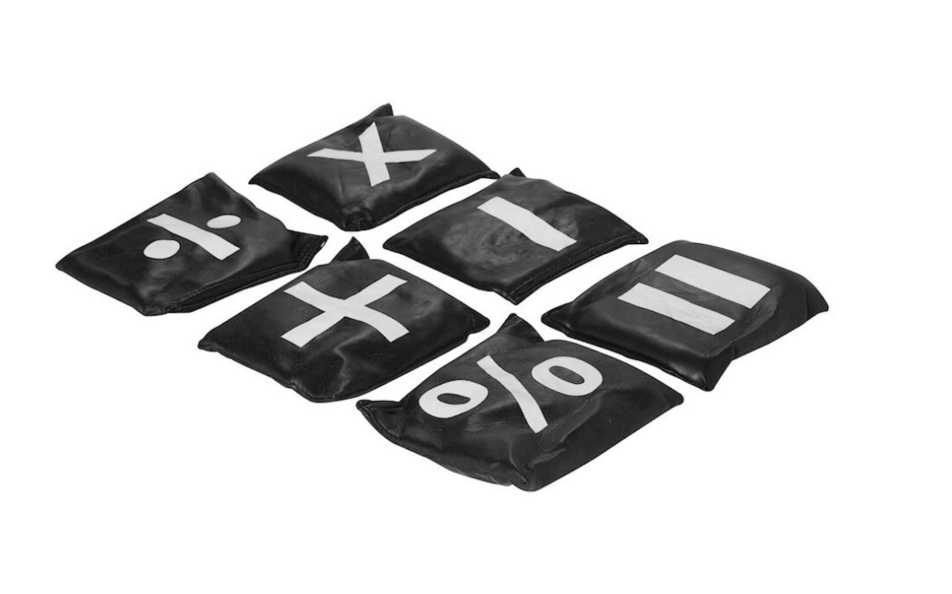 6 st/fp. Ett väldigt bra komplement i matematikundervisningen där rörelse främjar inlärningen. Innehåller: minus, plus, division, procent, lika med och gånger. Av PU, fyllda med plastpellets av PE. Mått: 12x12 cm.