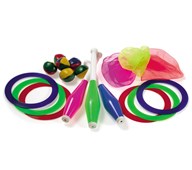 18 delar. Innehåller 6 jonglerringar ø 24 cm, 6 jonglerbollar, 3 nylonschalar 40x40 cm samt 3 käglor. Setet passar utmärkt att förvara i box 28269-100, ingår ej.