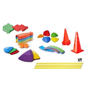 Ett stort härligt aktivitetspaket för träning, gymnastik, koordinationsträning eller bara som ett roligt inslag på rasten. Produkterna går utmärkt att använda var för sig eller som stationer. Setet innehåller 2 löpstegar, 16 koordinationsringar, 12 returhäckar i 2 olika storlekar, 6 slalomstolpar, 12 stavar att ställa i konerna samt fästen till dem, 24 markeringskoner med tillhörande konhållare samt 8 större koner med hål.