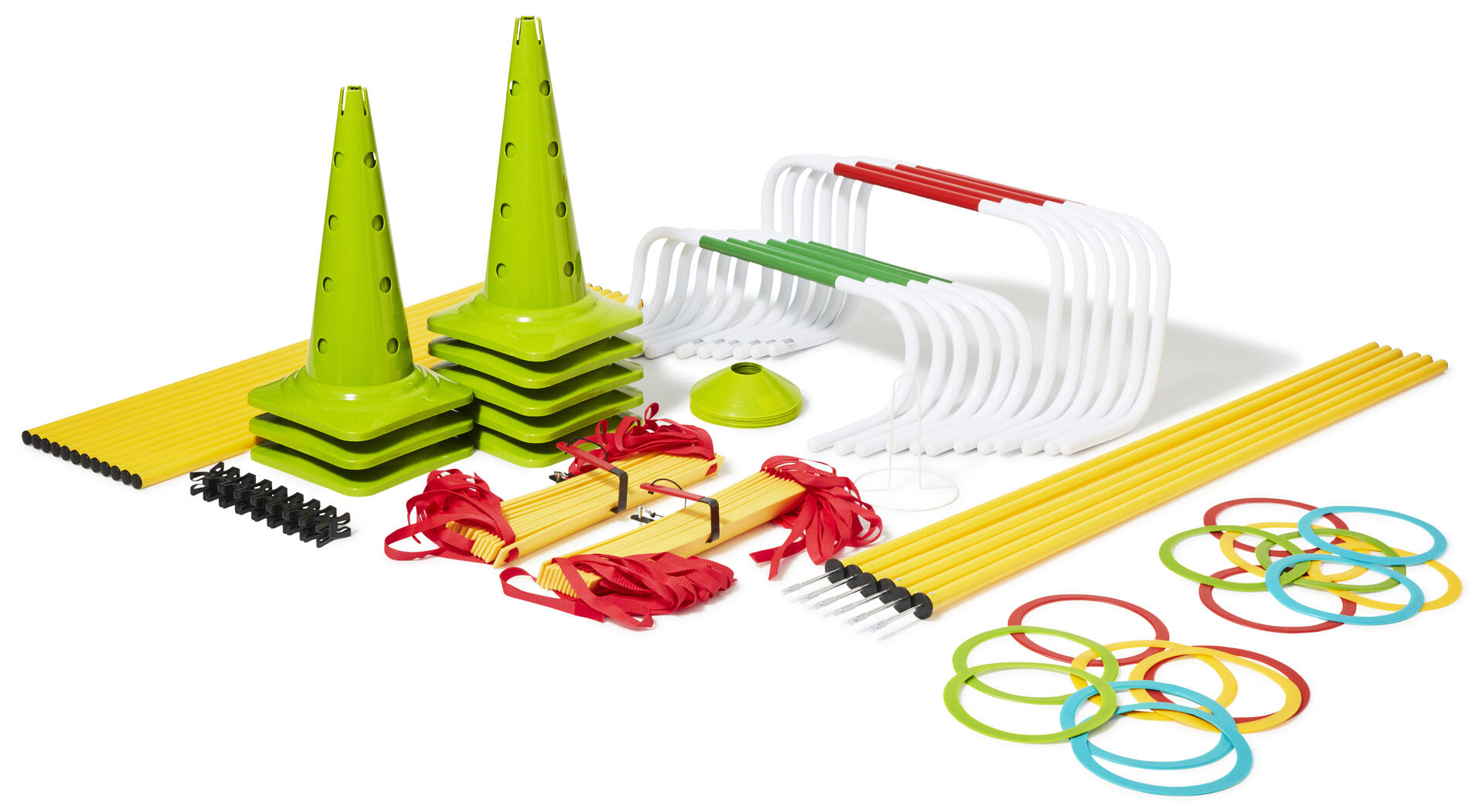 Ett stort härligt aktivitetspaket för träning, gymnastik, koordinationsträning eller bara som ett roligt inslag på rasten. Produkterna går utmärkt att använda var för sig eller som stationer. Setet innehåller 2 löpstegar, 16 koordinationsringar, 12 returhäckar i 2 olika storlekar, 6 slalomstolpar, 12 stavar att ställa i konerna samt fästen till dem, 24 markeringskoner med tillhörande konhållare samt 8 större koner med hål.