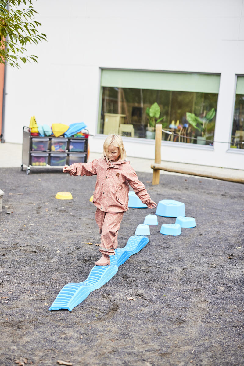 Detta är en imitation av stigarna i naturen: barnen får en känsla av att gå barfota utomhus även inomhus. Den ergonomiska formen är designad speciellt för att ge utsträckning och spänning i hålfoten. Ger övning att gå i olika terränger. Mått: längd ca 53–68 cm, höjd ca 4–11 cm. Av polypropen och TPE-plast. PVC-fri. Från 3 år.