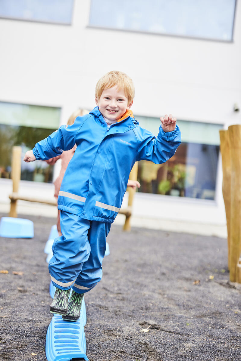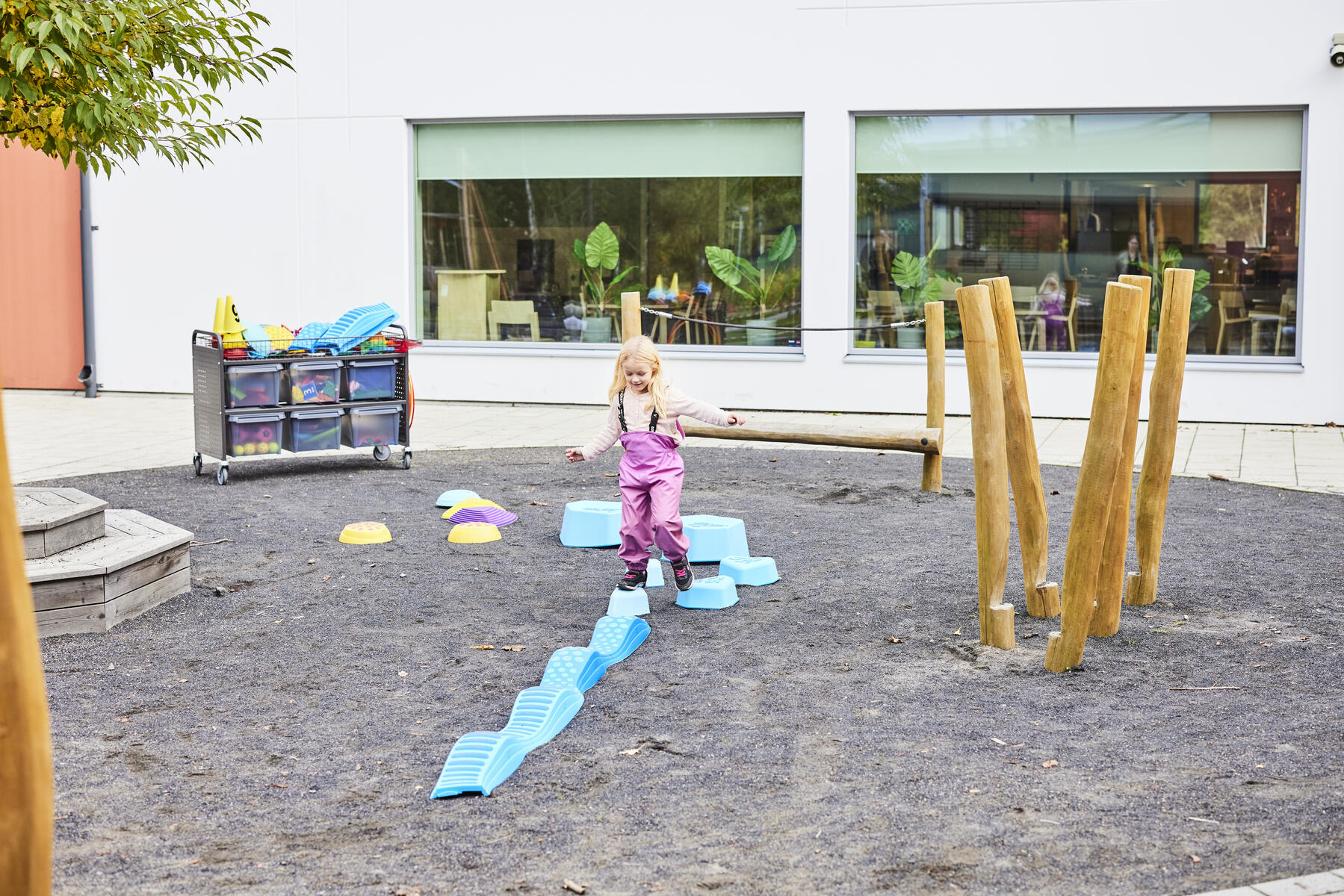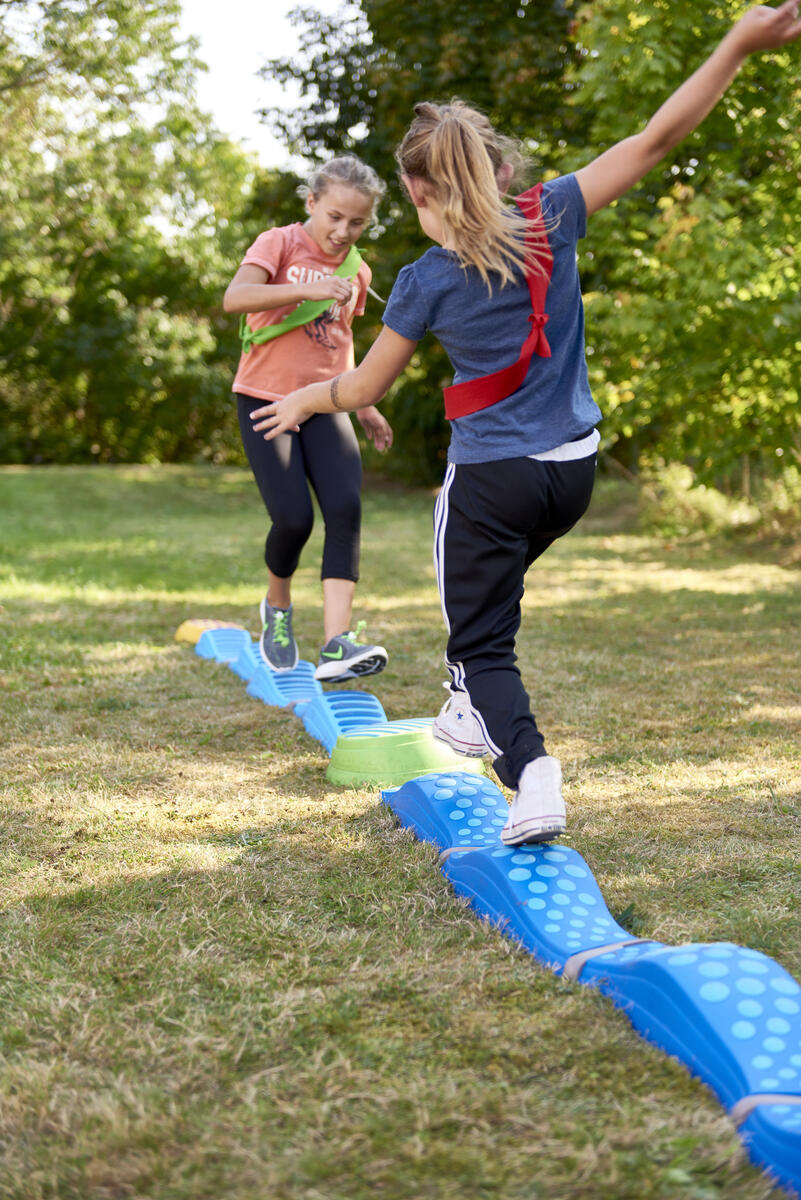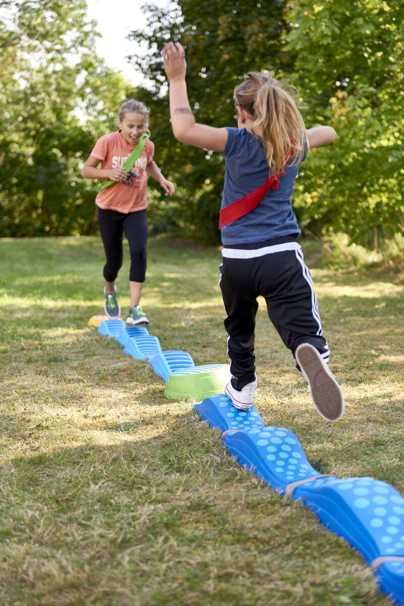 Med banans stora flexibilitet kan svårighetsgraden varieras efter barnens olika utvecklingsnivåer. Banan kan byggas i höjder 10–24 cm beroende på hur modiga barnen är. Med de olika taktila och rörliga plankorna påminner upplevelsen om en verklig skogspromenad bland stockar och stenar. Innehåller 10 toppar i olika höjder, 8 olika sorters plankor, en sviktande topp samt 3 stavar för att bygga hinder. Maxvikt 100 kg, OBS! Slackline har endast en maxvikt på 50 kg. Av PP och TPE. PVC-fri. Från 1½ år.