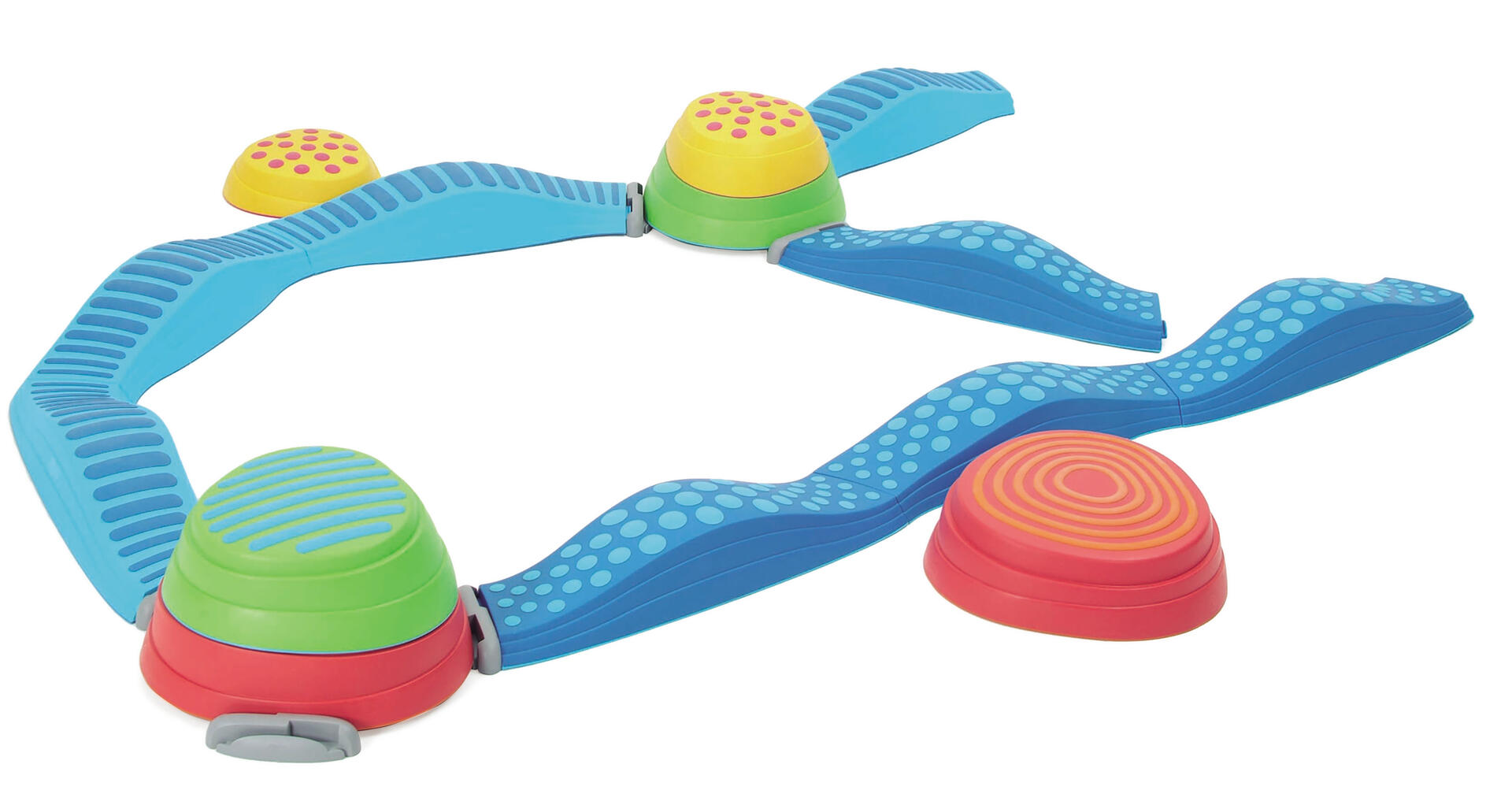 Köp hela setet med Step Stones, taktila stigar samt kopplingar. Setet passar bra för lek på golvet, barnen övar balans och koordination. Stigarna är ergonomiska i formen och är designad speciellt för att få barnen att uppleva utsträckning och spänning i hålfoten. Barnen övar även upp sin förmåga att gå i olika terränger. Av PP och TPE. PVC-fri. Från 3 år.