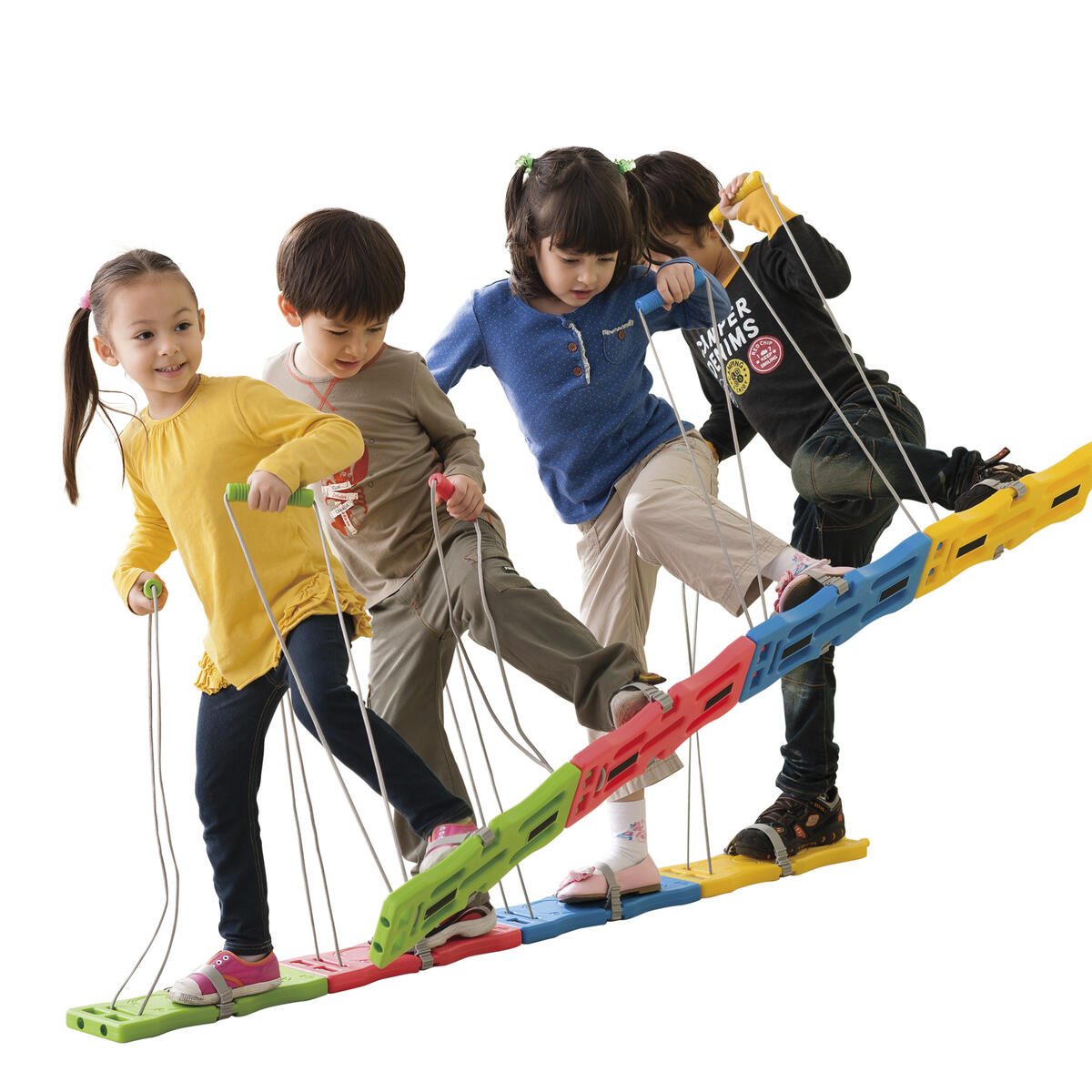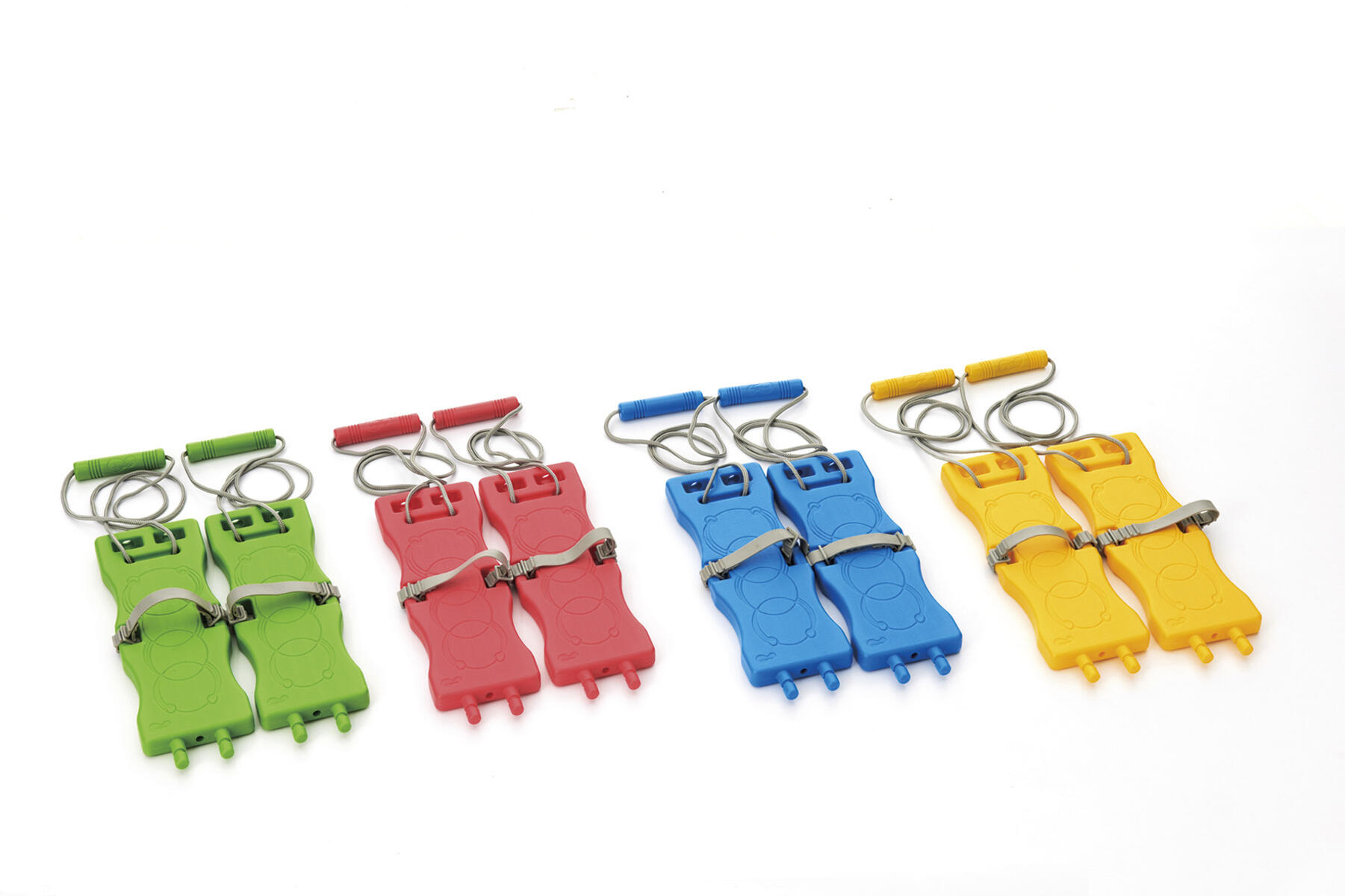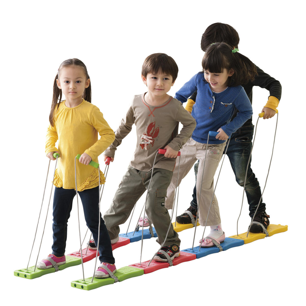 Samarbetsgång för 4 barn. Skidor för träning av koordination och viktförskjutning. Låt barnen gå en och en eller koppla ihop delarna och träna samarbete. Av PE och TPE. PVC-fri. Från 3 år.