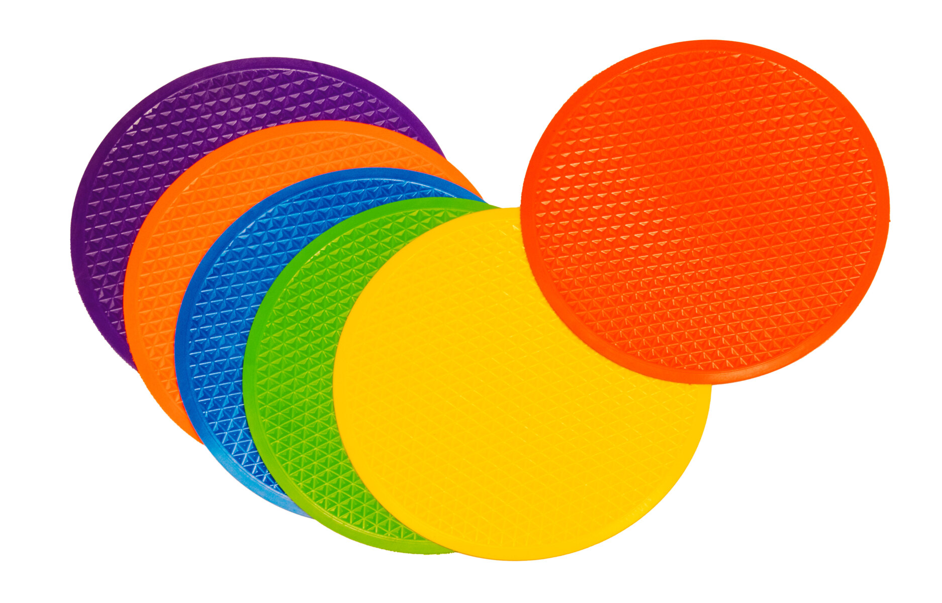12 par/fp. Perfekt golvmarkering för lekar, motorikbanor och balansövningar i 6 olika färger. Tillverkade i halkfritt material som ligger stabilt på golvet. Fungerar även utomhus. Av TPE.