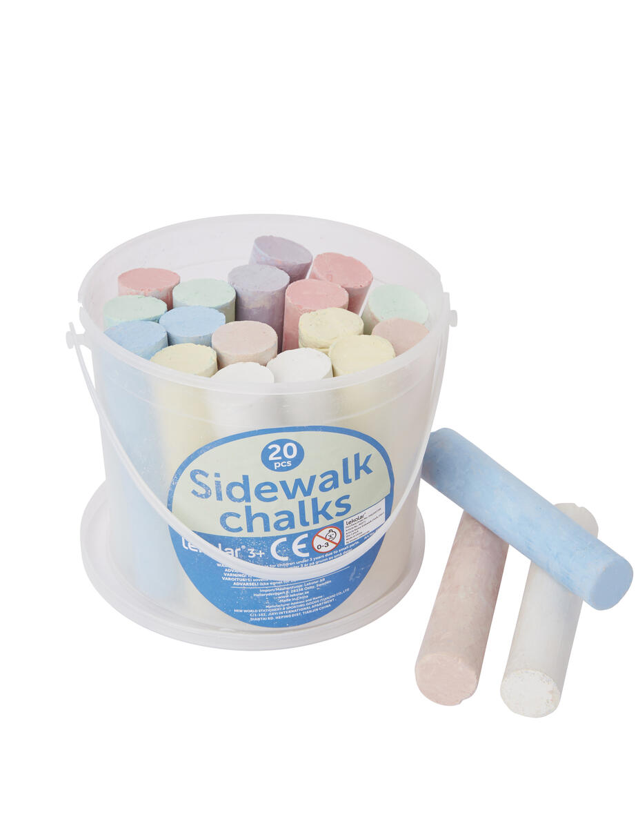 50 st/fp. Rita hopphagar, roliga gubbar och annat fint på asfalten. Tvättas enkelt bort med vatten. Innehåller 50 st kritor i mixade färger. Levereras i praktisk förvaringshink med lock. Längd per krita 10 cm. PVC-fri. Från 3 år.