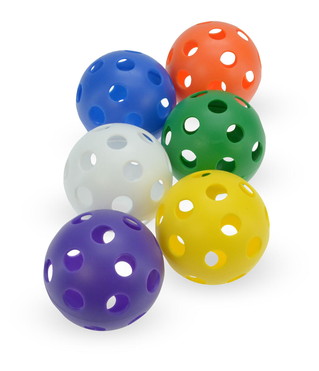 6 st/fp. Innebandybollar i större format som är bra som nybörjarbollar, då de är lättare att se och rullar något långsammare. Blandade färger. ø 9 cm. Av LDPE.
