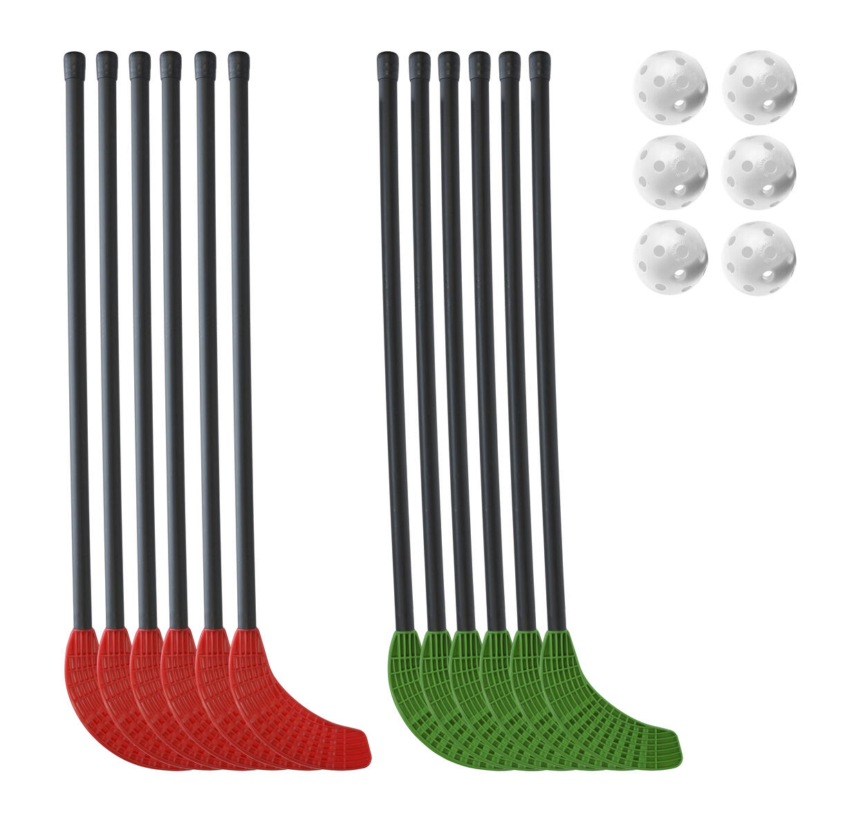 Storpack med 12 klubbor i två olika färger samt 6 bollar. Klubba för tuffa underlag, mycket slitstark. Totallängd 115 cm, skaftlängd: 95 cm. Polyetenplast. Vikt 251 g.