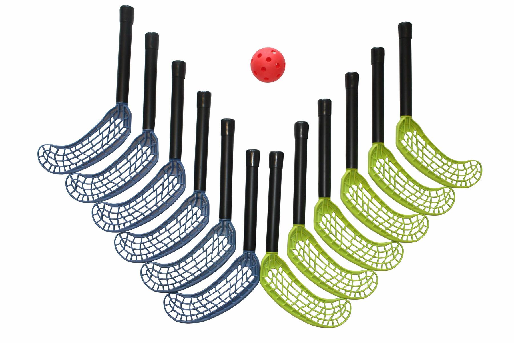 Ett set med korta innebandyklubbor för spel inomhus, t.ex. i mindre lokaler där barnen sittande på golvet spelar minibandy. De passar även utmärkt att använda med rullbräden 74853. Innehåller 12 klubbor och en boll. Skaftlängd 20 cm. Bladet är gjort av HDPE och skaftet av PP.