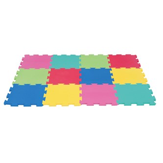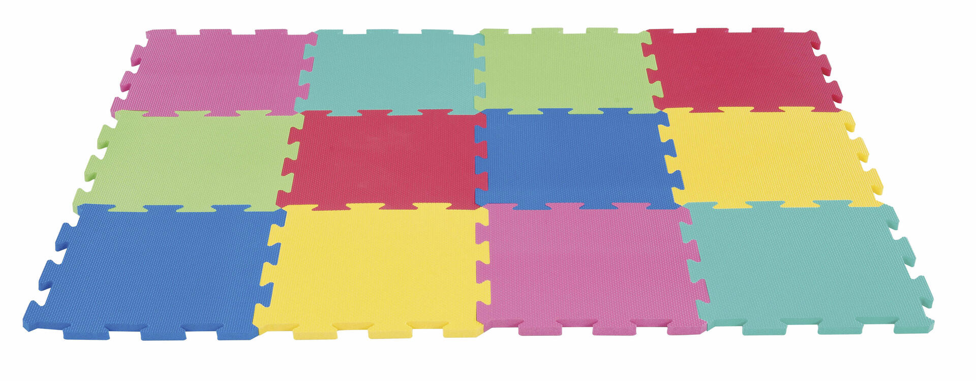 Mattan kan användas på båda sidor och den tandade kanten möjliggör hopkoppling. Till varje pusselbit ingår 4 kantlister. Godkänt fallunderlag enligt europeisk standard EN1177:2018 för inomhusanvändning till en fallhöjd på 145 cm. Mått: 100x100x4 cm.
