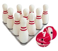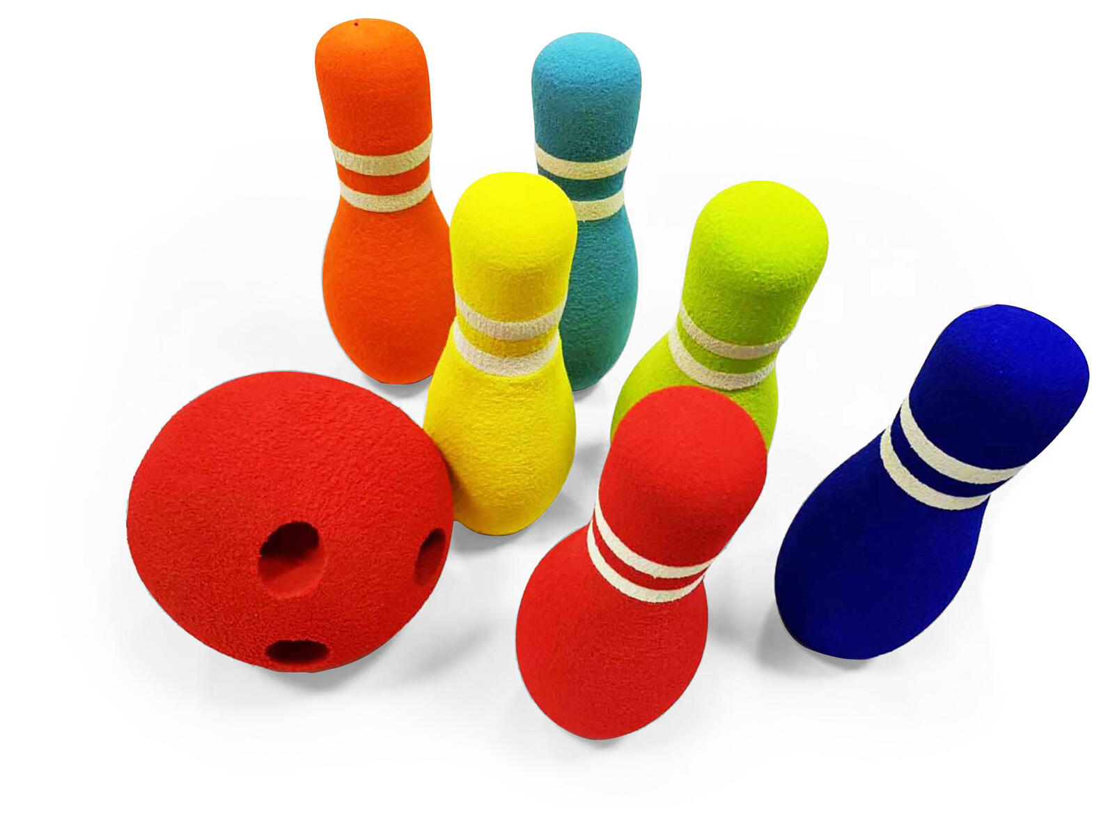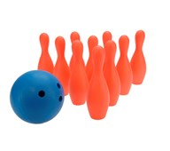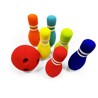Ett bowlingset i skum med mjuka tysta käglor. Med en bas av järn och ett yttre hölje av en mjuk ABS. 6 käglor H20 cm, ett klot ø 12 cm. PVC-fri. Från 3 år.