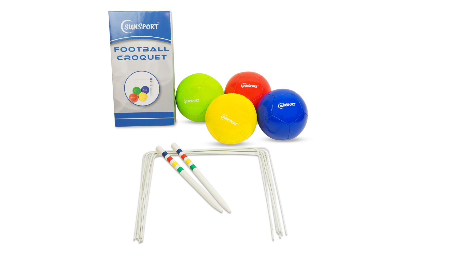 Krocket i en version där fötterna används istället för klot och slagträ. Setet innehåller 4 bollar, 2 målpinnar och 10 bågar. Mått: bollarna ø 17 cm, bågarna 39x39 cm. Av metall, trä och TPU. Från 3 år.