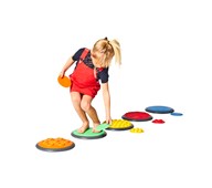 7 delar. Balansplattor som kan sättas ihop till en mängd olika motorikbanor. 6 olika färger. 6 av delarna har måtten 35,5x11,5 cm, och 1 del är 15,5x8,5 cm. Alla delar är 4,5 cm höga. Av plast med glidsäkra gummikanter. Stapelbara för enkel förvaring. Av PP och TPE. PVC-fri. Från 2 år.