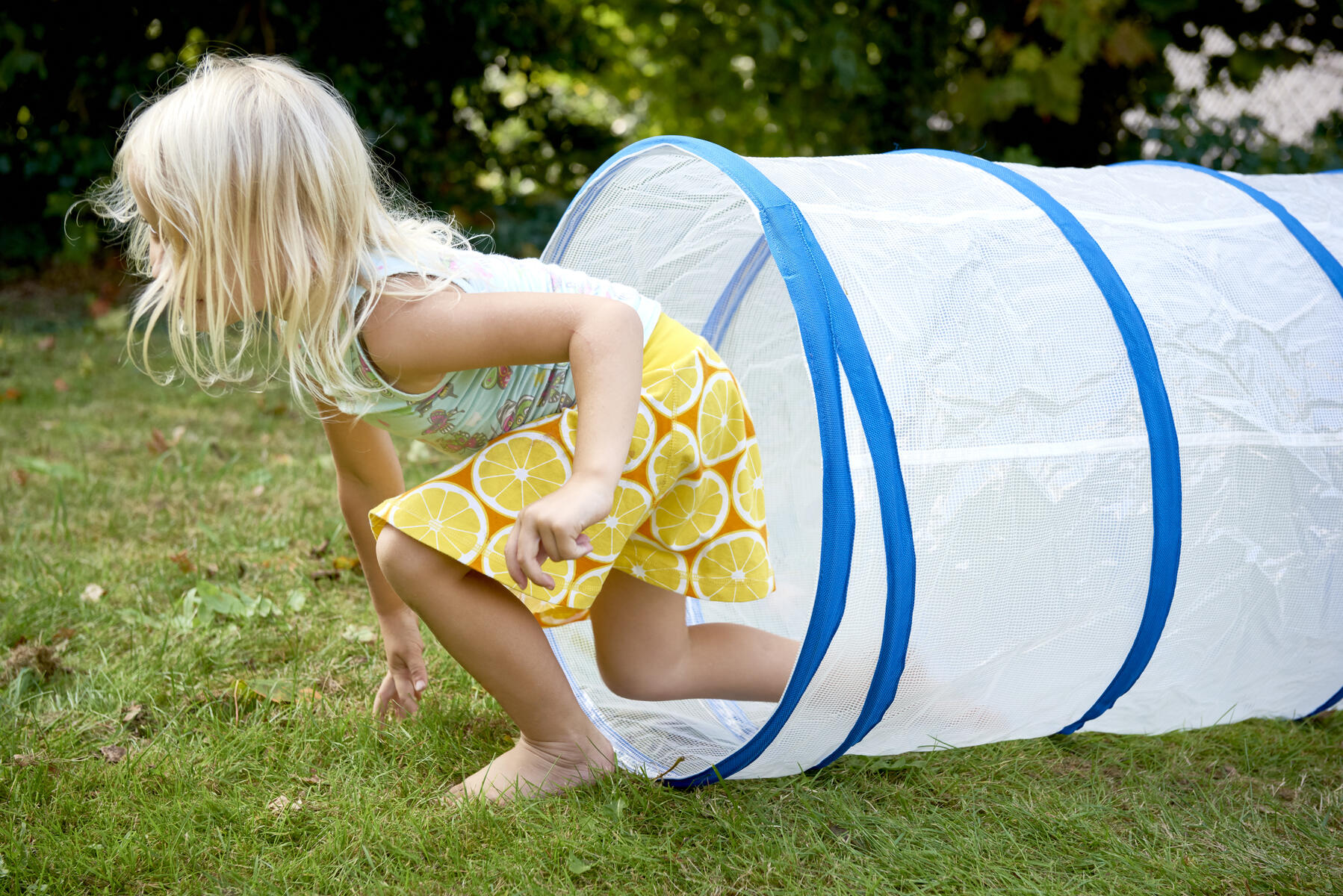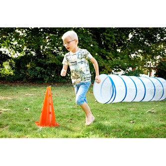 Denna långa tunnel kan vridas och böjas i önskad riktning för att konstruera spännande krypvägar. Tunnelns ena sida är av finmaskigt nät så att barnen kan kika ut. Perfekt för både inom- och utomhuslek samt motoriska övningar. Tillverkad av slitstark nylon. Mått: längd 280 cm, ø 53 cm. PVC-fri.