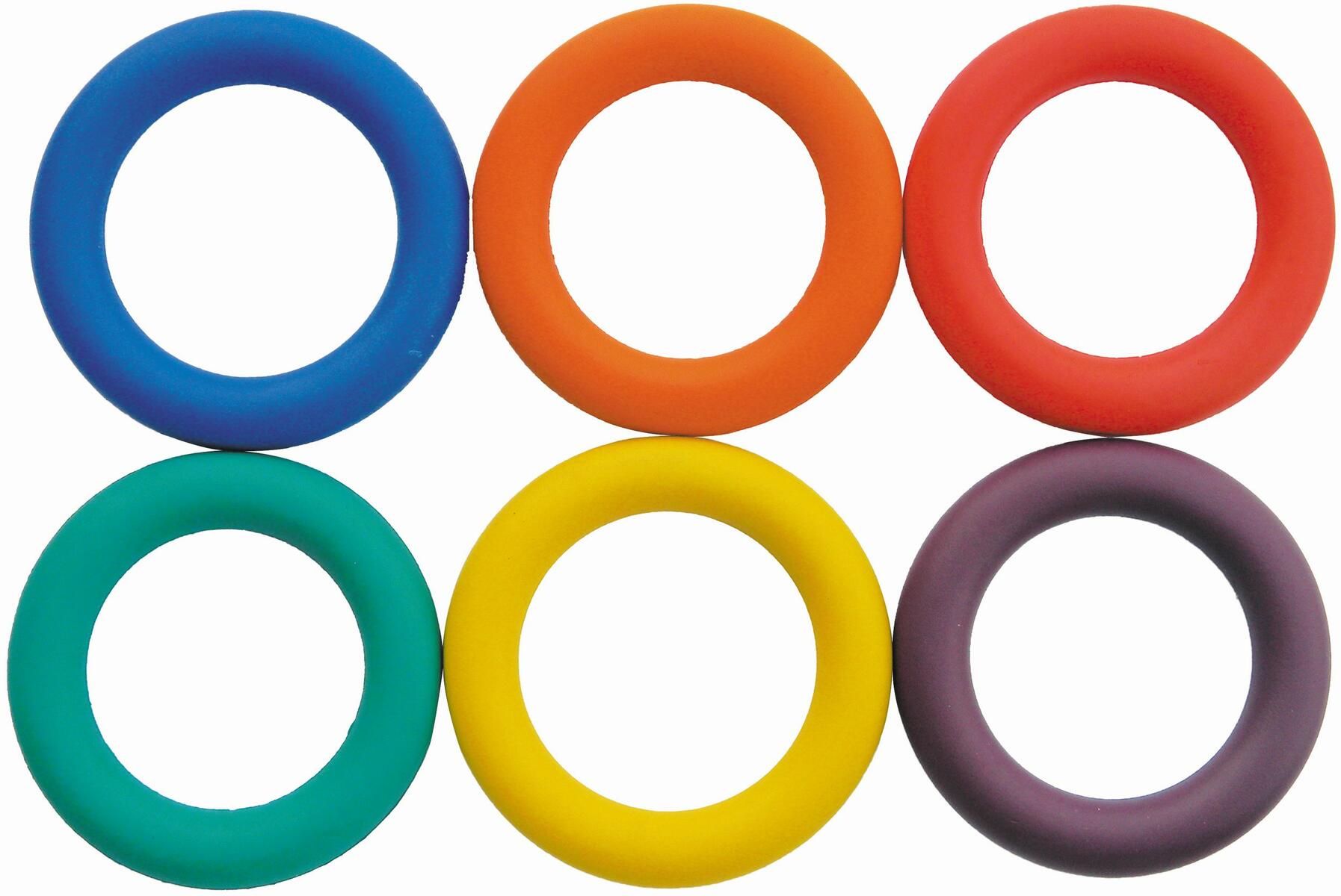 6 st/fp. Färgstarka och tilltalande ringar av gummi med oändliga användningsområden som t.ex. jonglering, kast- och fångövningar, dans, gå på tå, räkneövningar m.m. Passar både individuellt och i grupp. Mått ca 16 cm. PVC-fri. Från 1½ år.