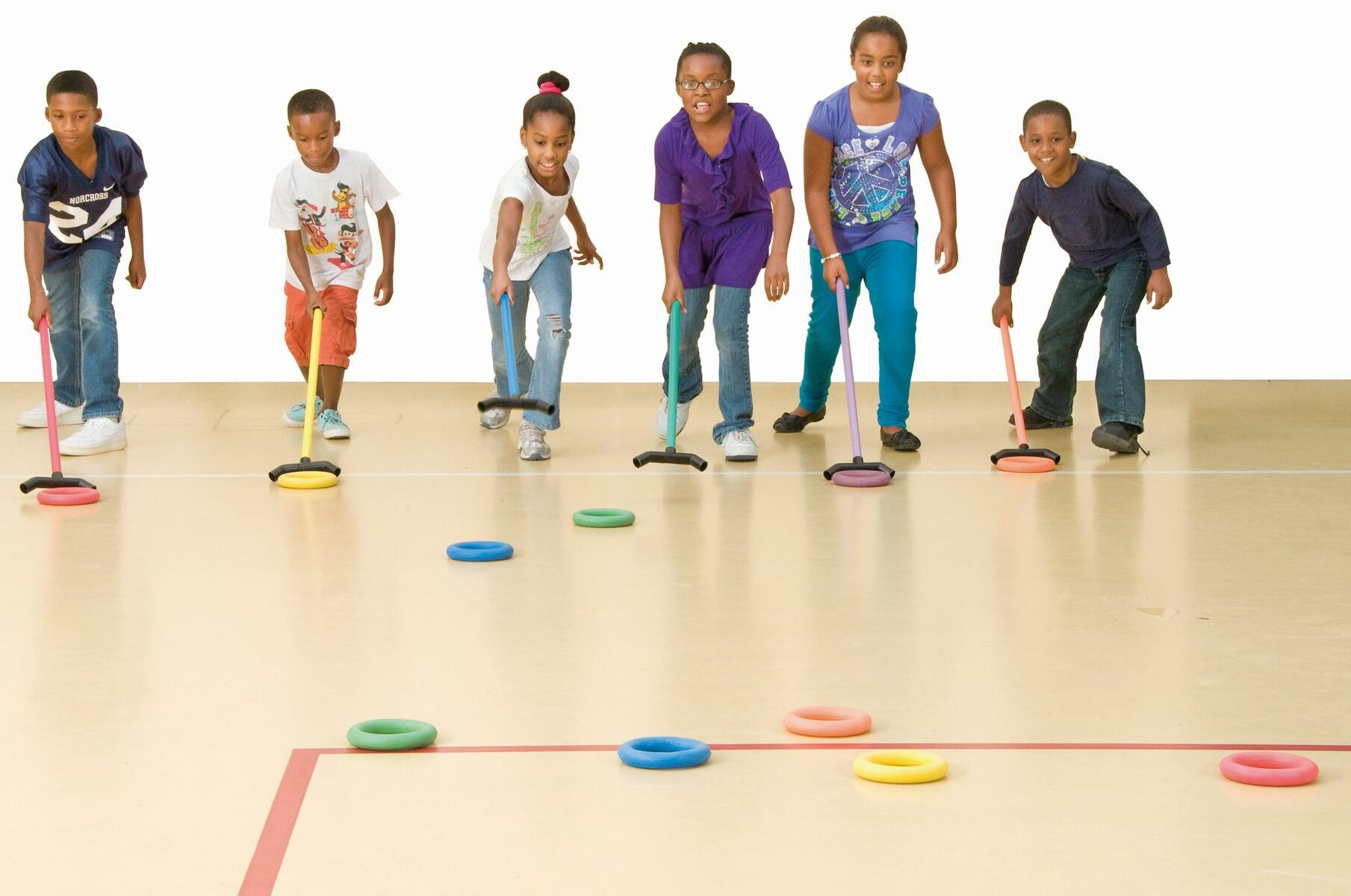 Ringar av gummi som kan användas till shuffleboard, men även många andra olika aktiviteter: kasta och fånga, rulla till varandra, som mål eller balansövningar. Ringarna glider bäst på vinylgolv eller polerat trägolv. Av gummi. Mått: ø 16 cm. PVC-fri.