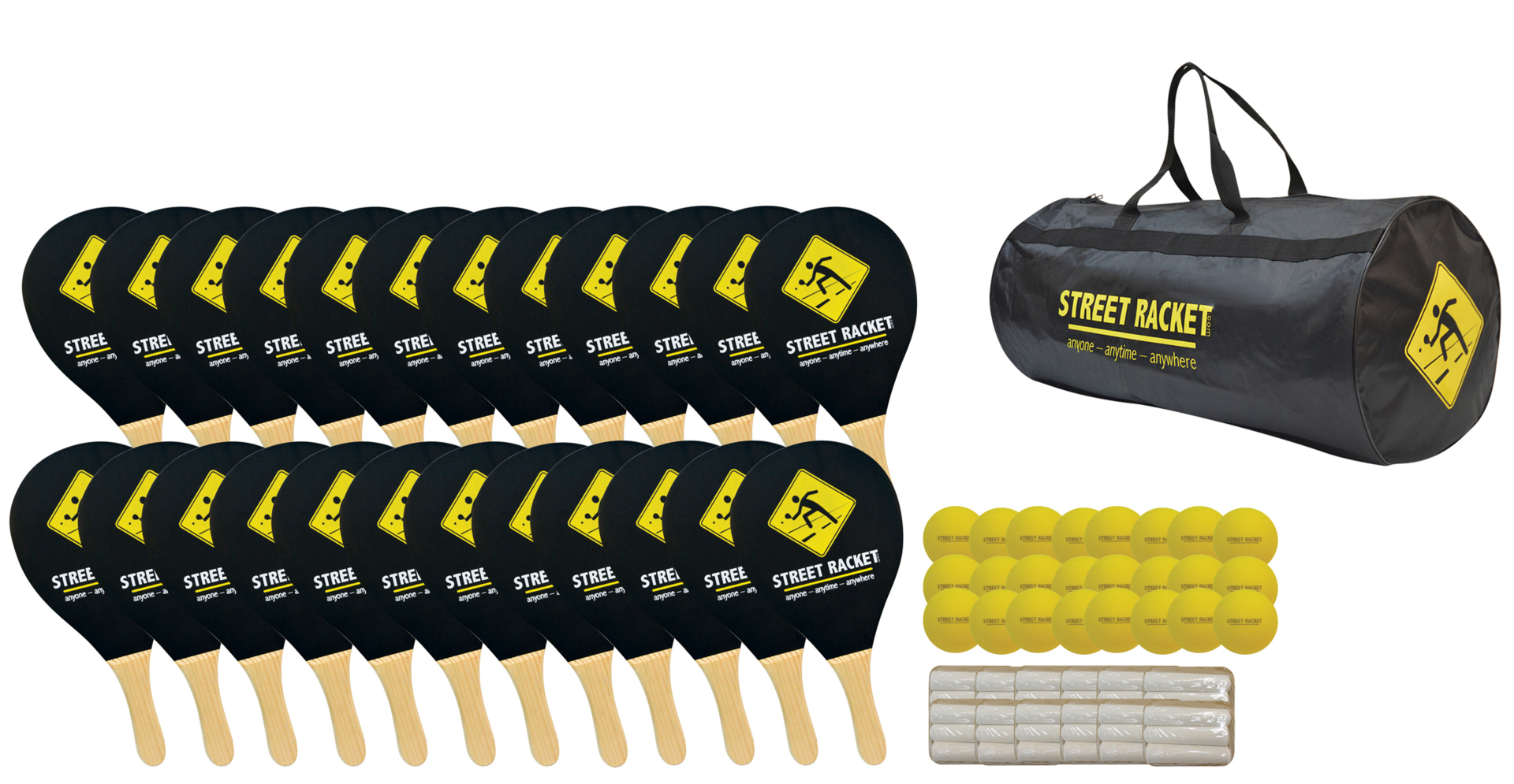Street Racket är ett energiskt och actionfyllt spel som passar elever i alla åldrar. Det kan spelas på alla typer av ytor både ute och inne, och kräver minimal utrustning. Paketet består av: 24 racketar, 24 skumbollar (ø 7 cm), 36 kritor för banmarkering, 12 infokort och 1 transportväska.