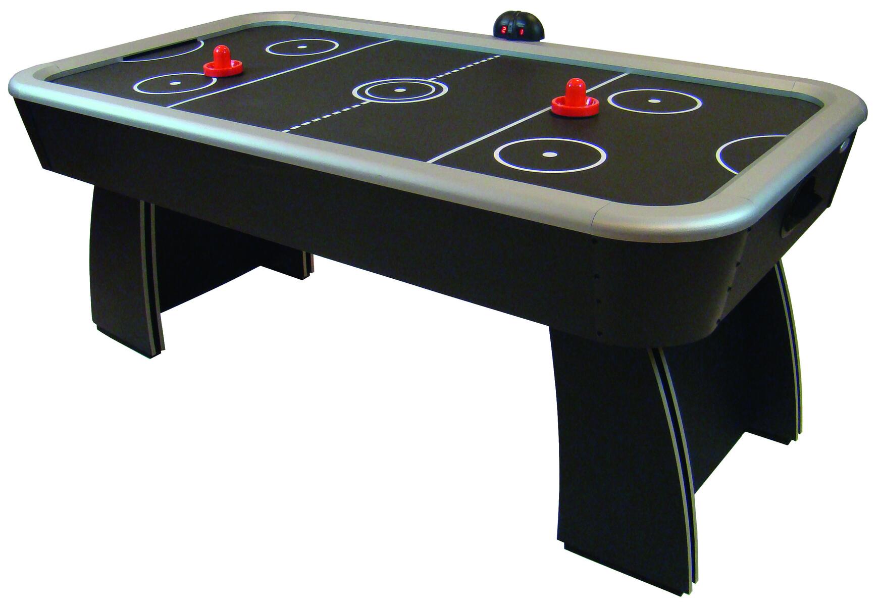 Fantastiskt roligt spel. Luften kommer upp genom små hål i spelplanen vilket gör att pucken svävar på en luftbädd. Stabil ben- och sargkonstruktion med ställbara ben. Spelyta av MDF med högglansbeläggning och integrerade LED i spelytan. En kraftfull 220V fläkt. Instruktioner för montering ingår, endast benställning behöver monteras. Medföljer 2 pushers/målvakter och 2 puckar. Mått: 183x79x91 cm. Vikt: 50 kg. Från 8 år.