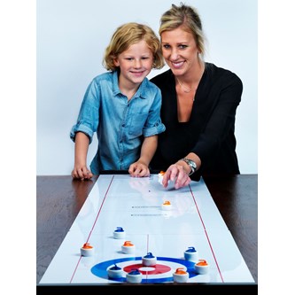 En rolig bordsvariant av curling/shuffleboard. Det är enkelt att sätta ihop: fästs med magnetlist under banan. Innehåller spelplan, 8 puckar (4 av varje färg) och en regelbok. För att byta spel är det bara att gå till den andra änden av spelplanen. Kan spelas i lag eller på egen hand. Av ABS och metall. Mått: 180x39 cm.