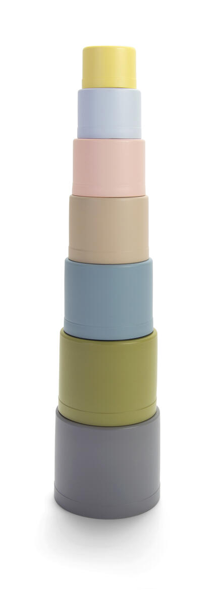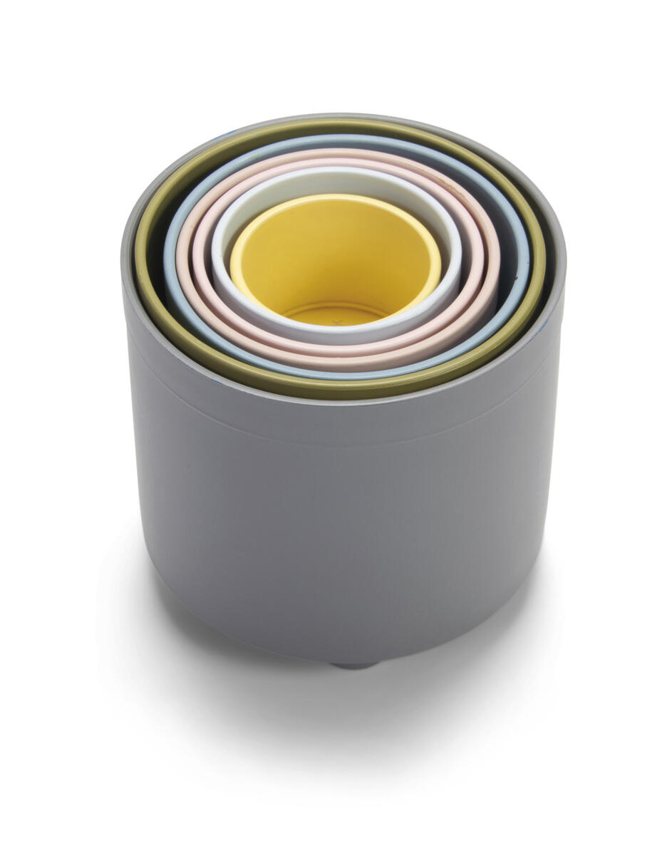 10 pedagogiska byggbägare numrerade 1–10 på ovansidan, där siffran 10 motsvarar den största hinken. Stapla och bygg, eller lek med sand och vatten. Bägarna har två små hål på ovansidan så att vatten eller sand kan strila igenom. Den smarta förvaringshinken har ett lock med 4 hål i form av geometriska former och 4 former för sortering medföljer. Totalhöjd 95 cm. Av polypropen och polyeten. PVC-fri. Från 1 år.