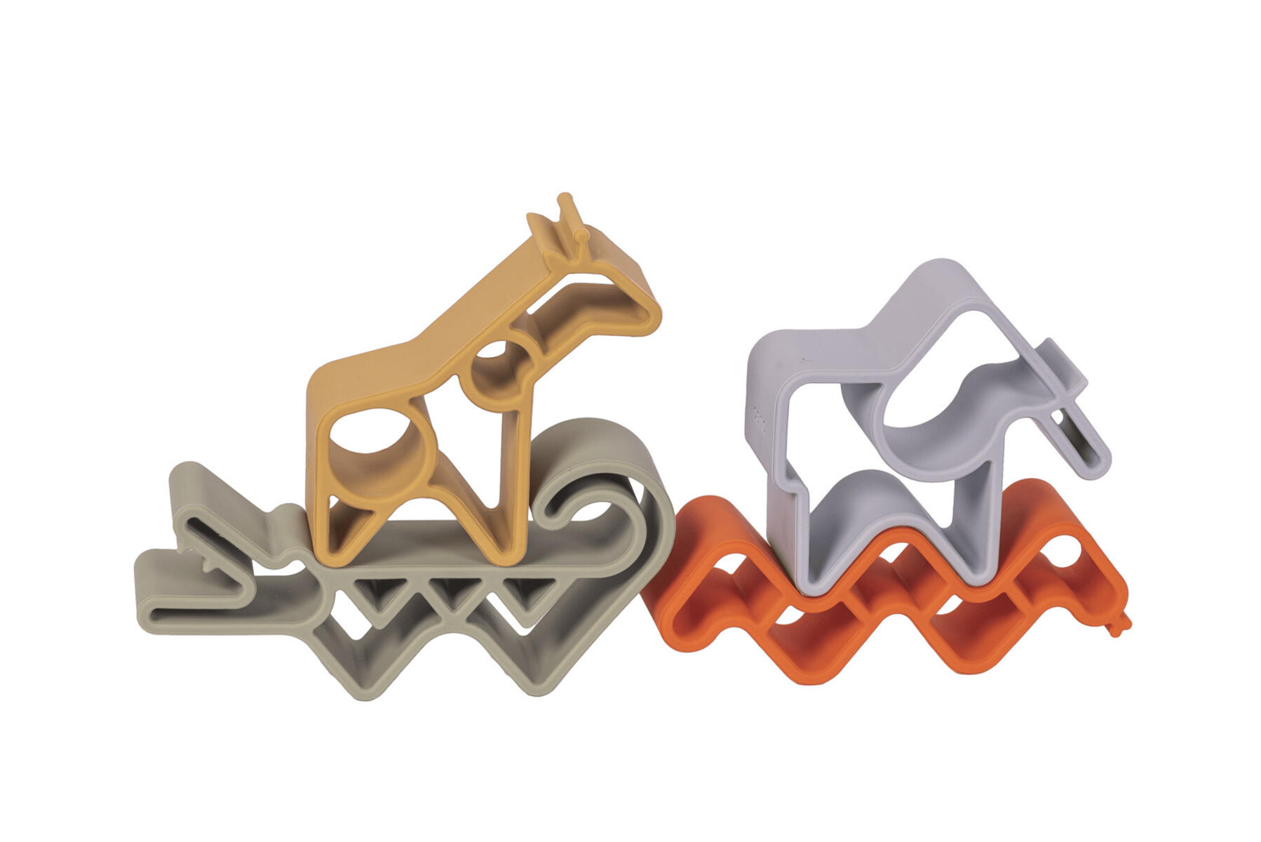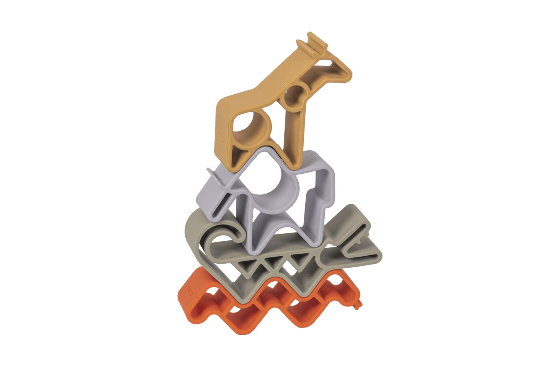 4 st/fp. Ett set med 4 djur i silikonmaterial som erbjuder många lekmöjligheter, från en bitring till ett konstruktionselement eller en bakform. Setet innehåller en krokodil, en elefant, en giraff och en orm. Samtliga produkter tål diskmaskin, mikrovågsugn och vanlig ugn upp till 230 °C. Kan frysas till -50 °C. Höjd på giraffen är 9 cm. PVC-fri. Från 0 år.