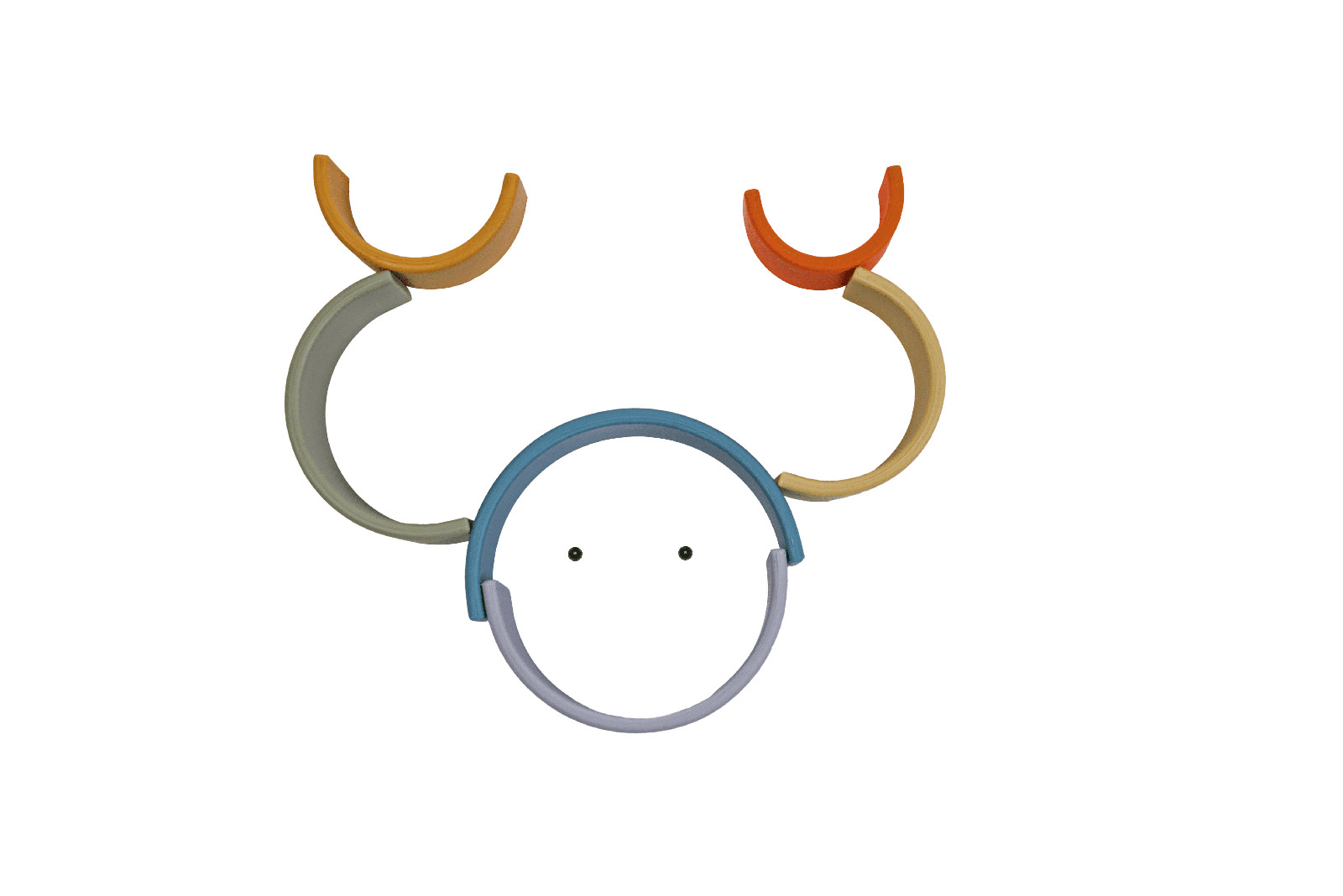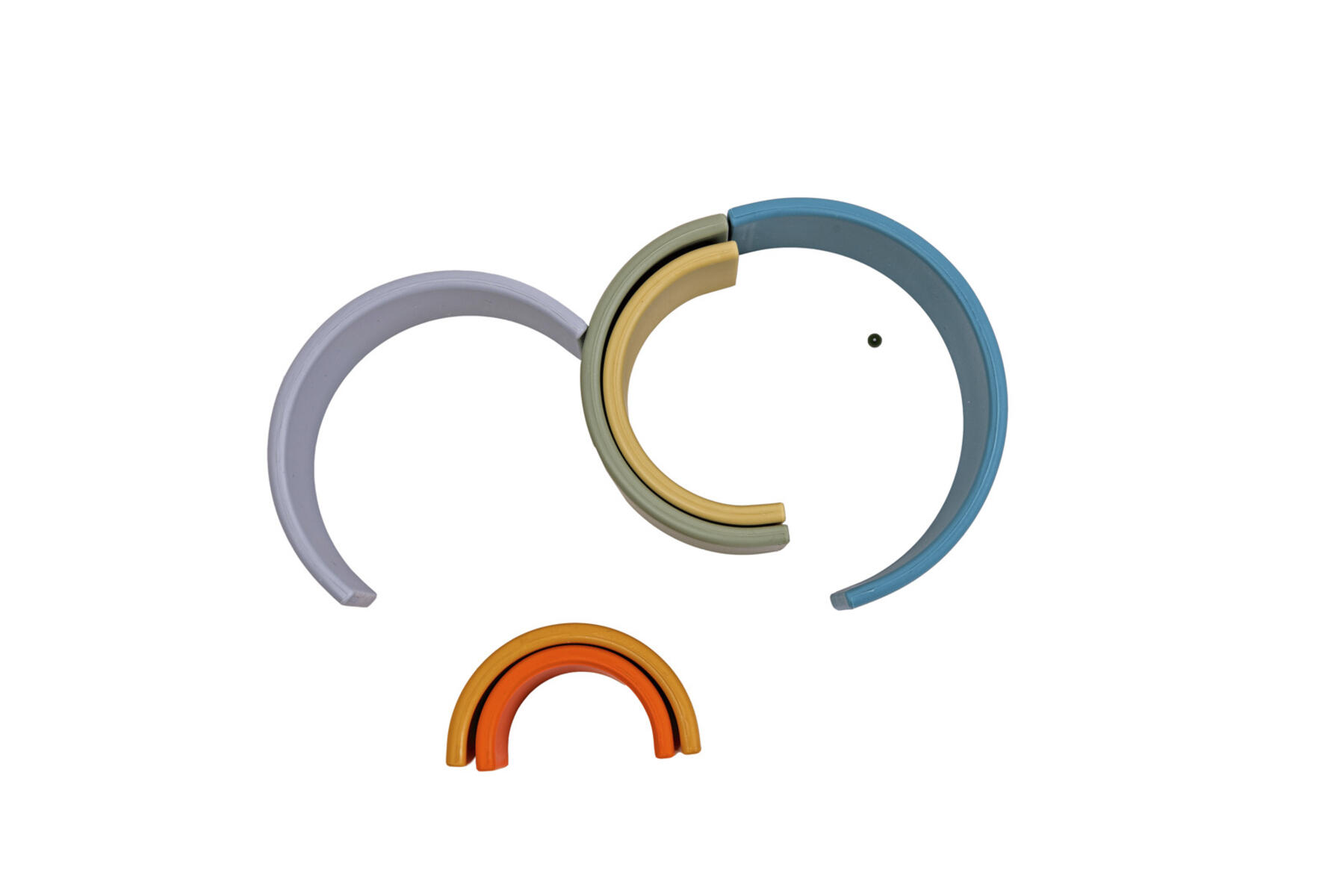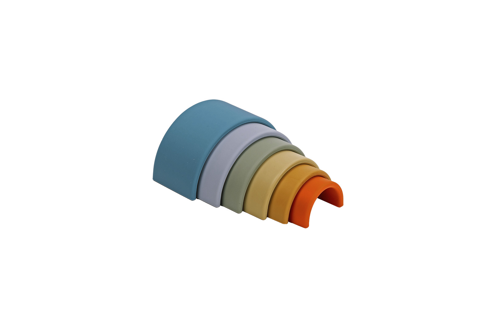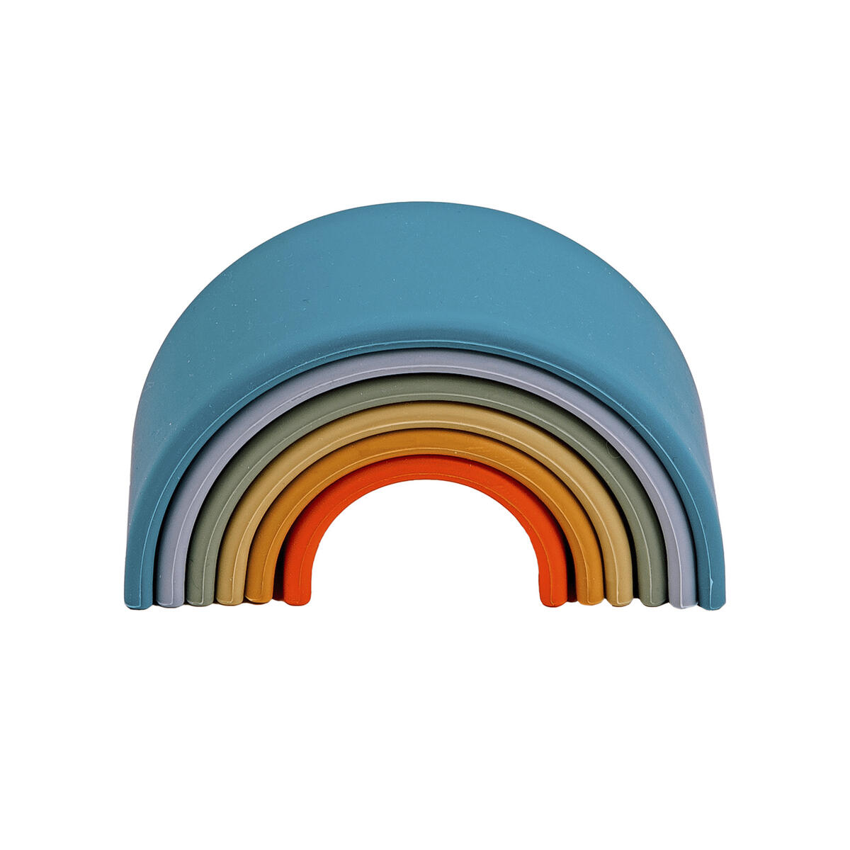 6 st/fp. Byggset i silikonmaterial, där de flerfärgade bitarna tillsammans skapar en vacker regnbåge. Delarna kan staplas och sorteras eller användas som t.ex. tunnlar och broar i en fantasifull lek. Tål diskmaskin, mikrovågsugn och vanlig ugn upp till 230 grader. De fungerar även i frysen ner till minus 50 grader. Längd på den största biten 10,5 cm. PVC-fri. Från 0 år.