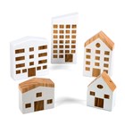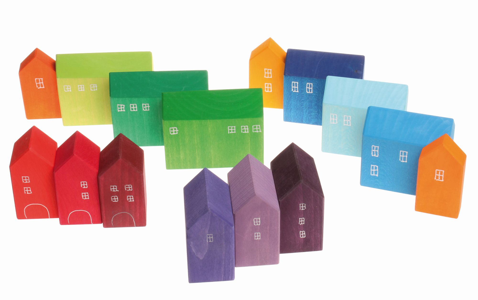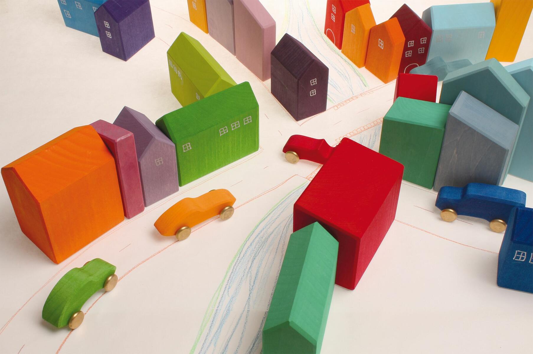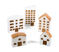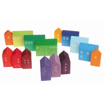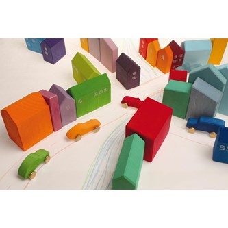 16 delar. Små härliga trähus i olika färger. Passar bra till barnens bygglek, trätågslek, berättelser m.m. Setet innehåller 15 hus med tillhörande träbricka. Målade med giftfria, vattenbaserade färger. PVC-fri. Från 1 år.
