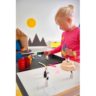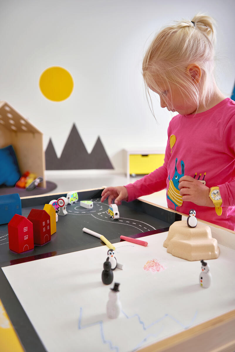 Fantasifull rollek med snyggt och enkelt illustrerade trähus, fordon och träd. Uppmuntrar barnen att skapa scenarier och fantasifulla historier. De stora delarna gör dem utmärkta för en liten hand att hantera. Av FSC-märkt trä. PVC-fri. Från 2 år.