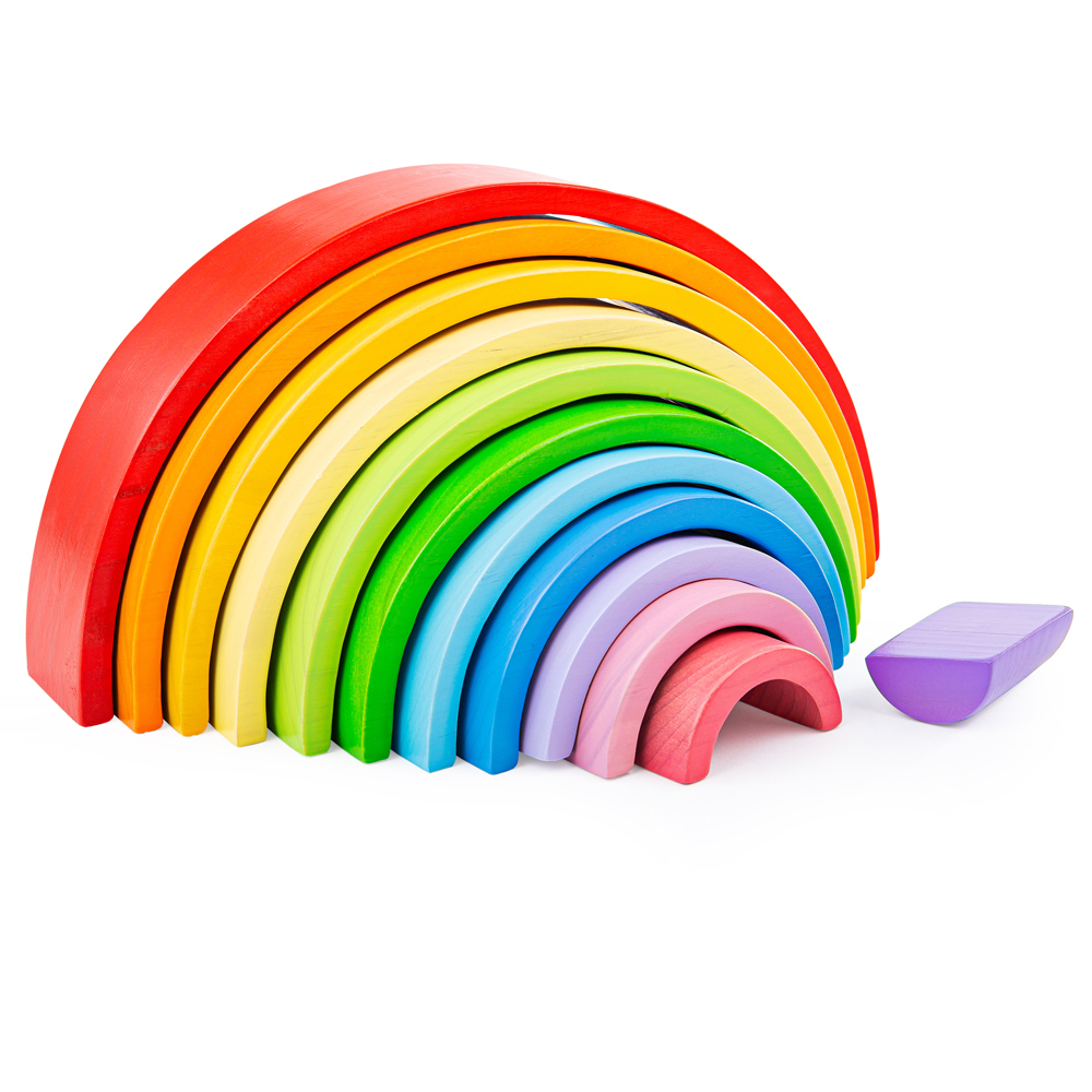6 delar. Byggset i trä där bitarna tillsammans skapar en vacker regnbåge. Bitarna kan användas som t.ex. tunnlar och broar tillsammans med andra typer av klossar. Yngre barn kan stapla och sortera klossarna. Målade med giftfria, vattenbaserade färger. PVC-fri. Från 1 år.
