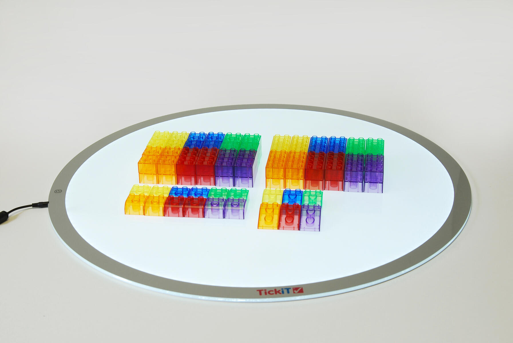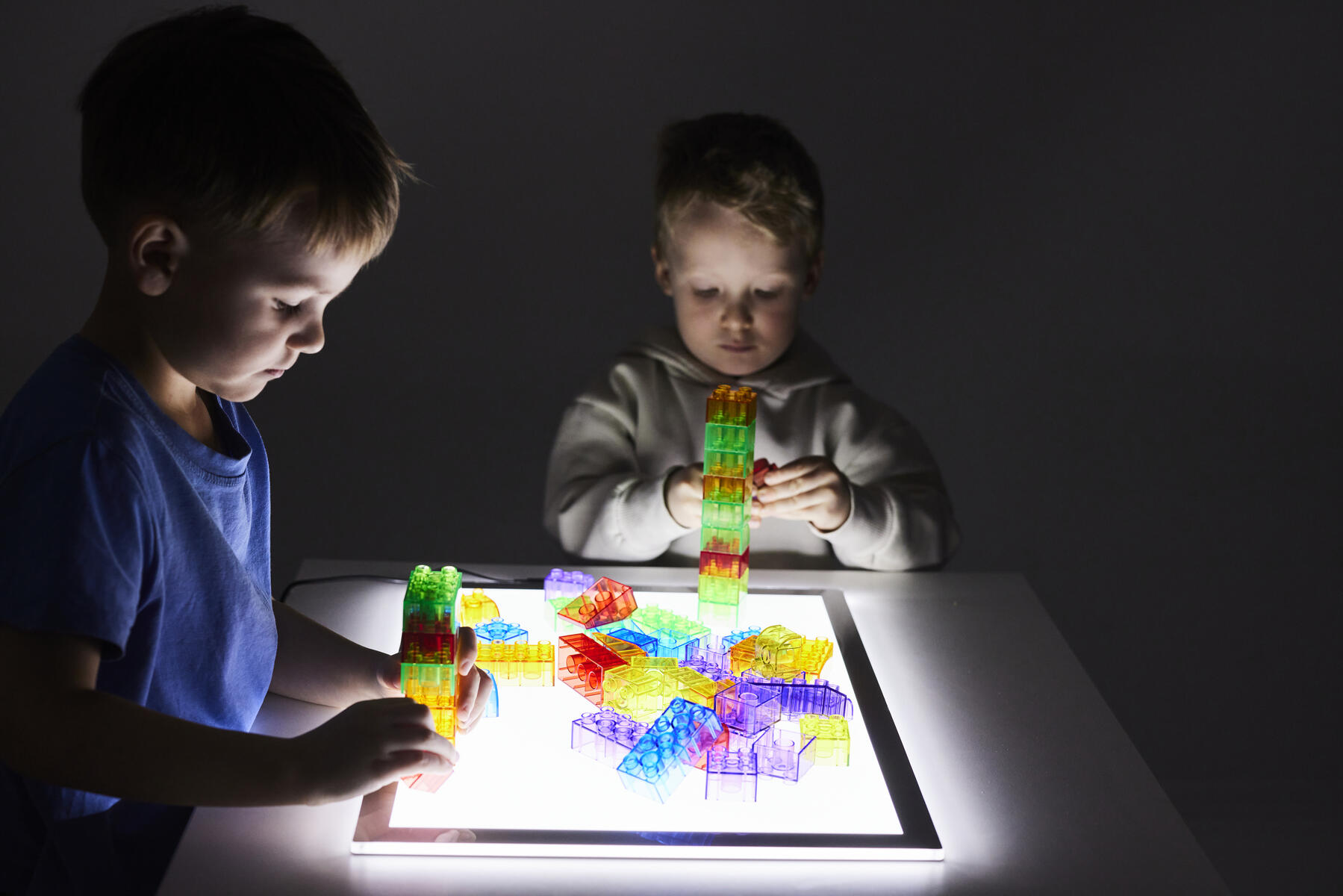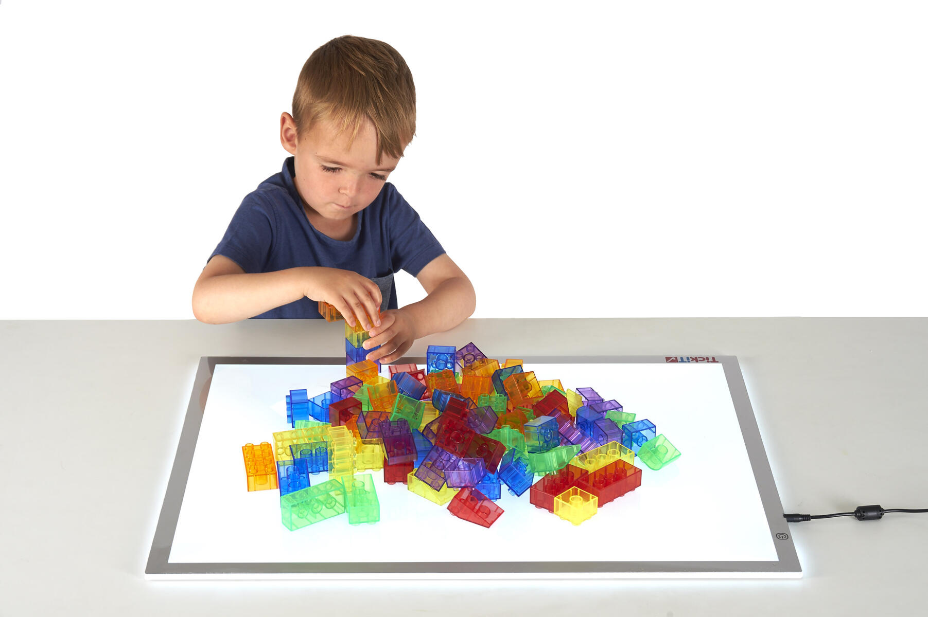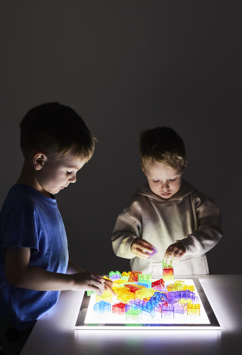 Lysande kuber som ändrar färg när de vänds. Kombinera gärna med transparenta klossar, eller byggklossar Glaciär, för att lysa upp en igloo eller ett färgat fönster. Uppladdningsbara med USB kabel. Av PP. PVC-fri. Från 0 år.