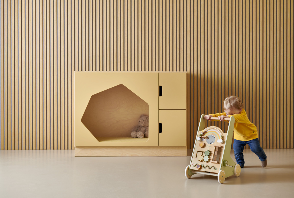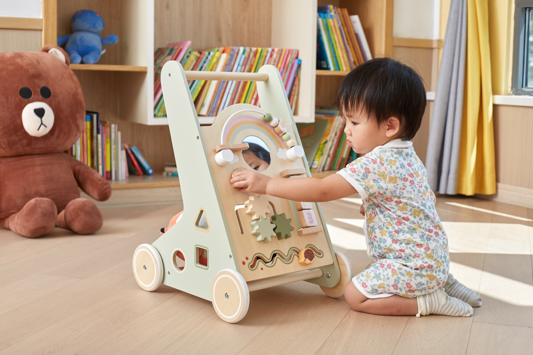 Gåvagn i trä med aktiviteter för barnet att utforska. Vagnen har kugghjul och kulor i trä, en spegel, en formsorterare och ett förvaringsutrymme baktill för dockor och leksaker. Stadig konstruktion som ger stöd för att gå. Av FSC-märkt trä. Från 12 månader.