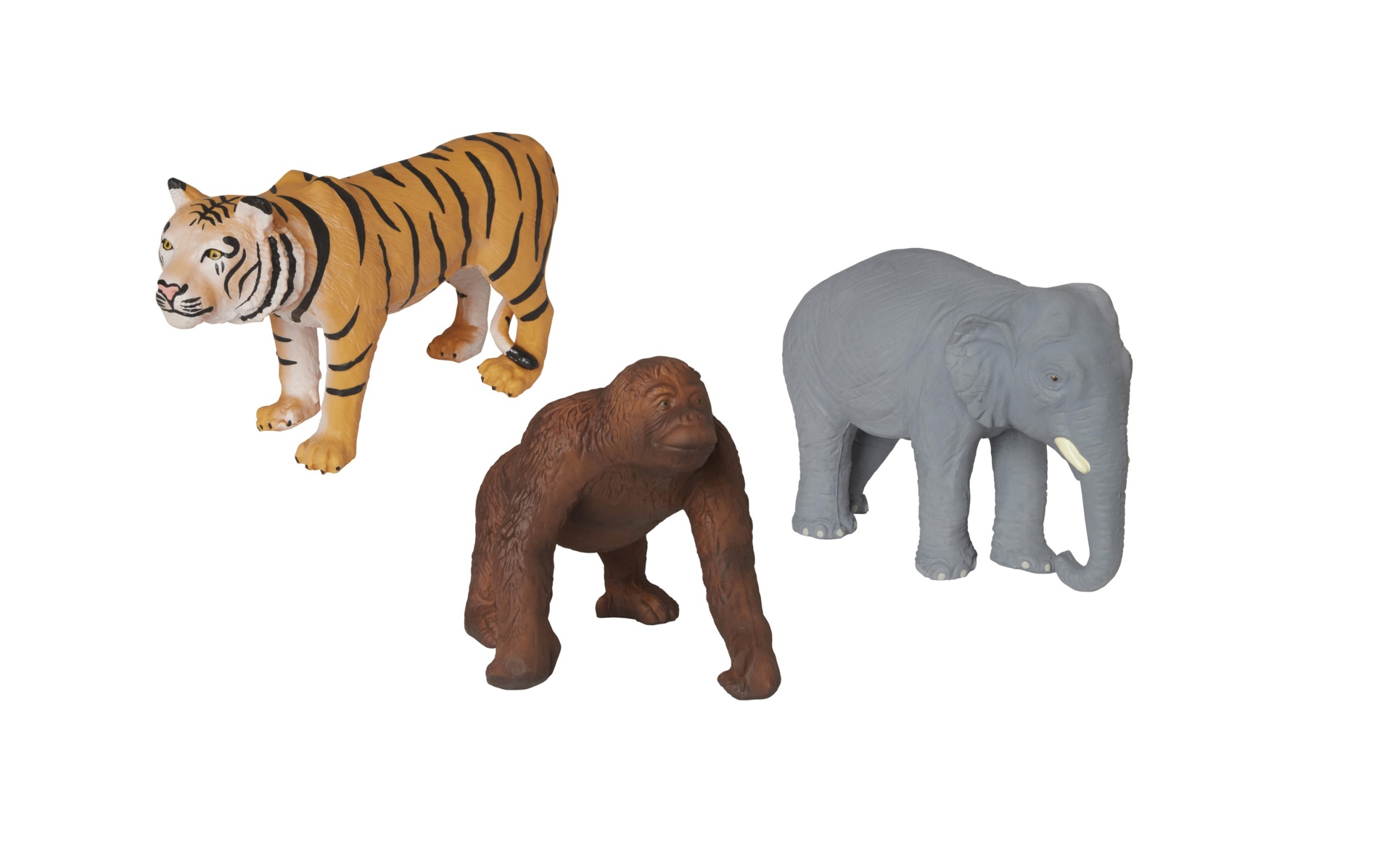 3 st/fp. Mjuka vilda djur som passar bra för de yngre barnen. Innehåller tiger, orangutang och elefant. Höjd på orangutang ca 14 cm. Av naturgummi. PVC-fri. Från 1 år.