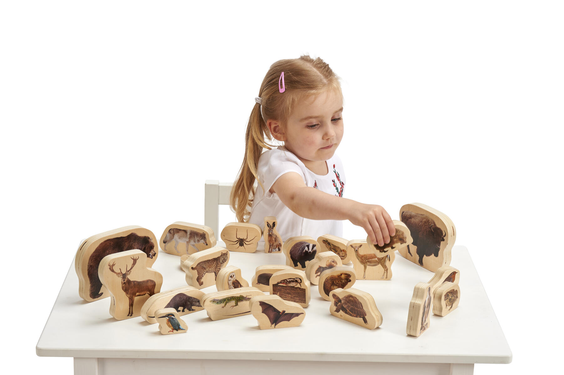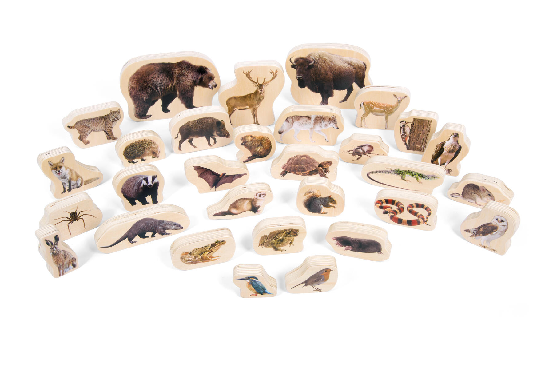 30 delar. Robusta träblock med tryckta fotografiska motiv av skogens djur på båda sidor. Motiven gör det möjigt för yngre barn att känna igen riktiga djur i sina naturliga miljöer. Passar i rollek och utvecklar beskrivande språkkunskaper. Innehåller motiv på insekter, fåglar, reptiler och däggdjur. PVC-fri. Från 0 år.
