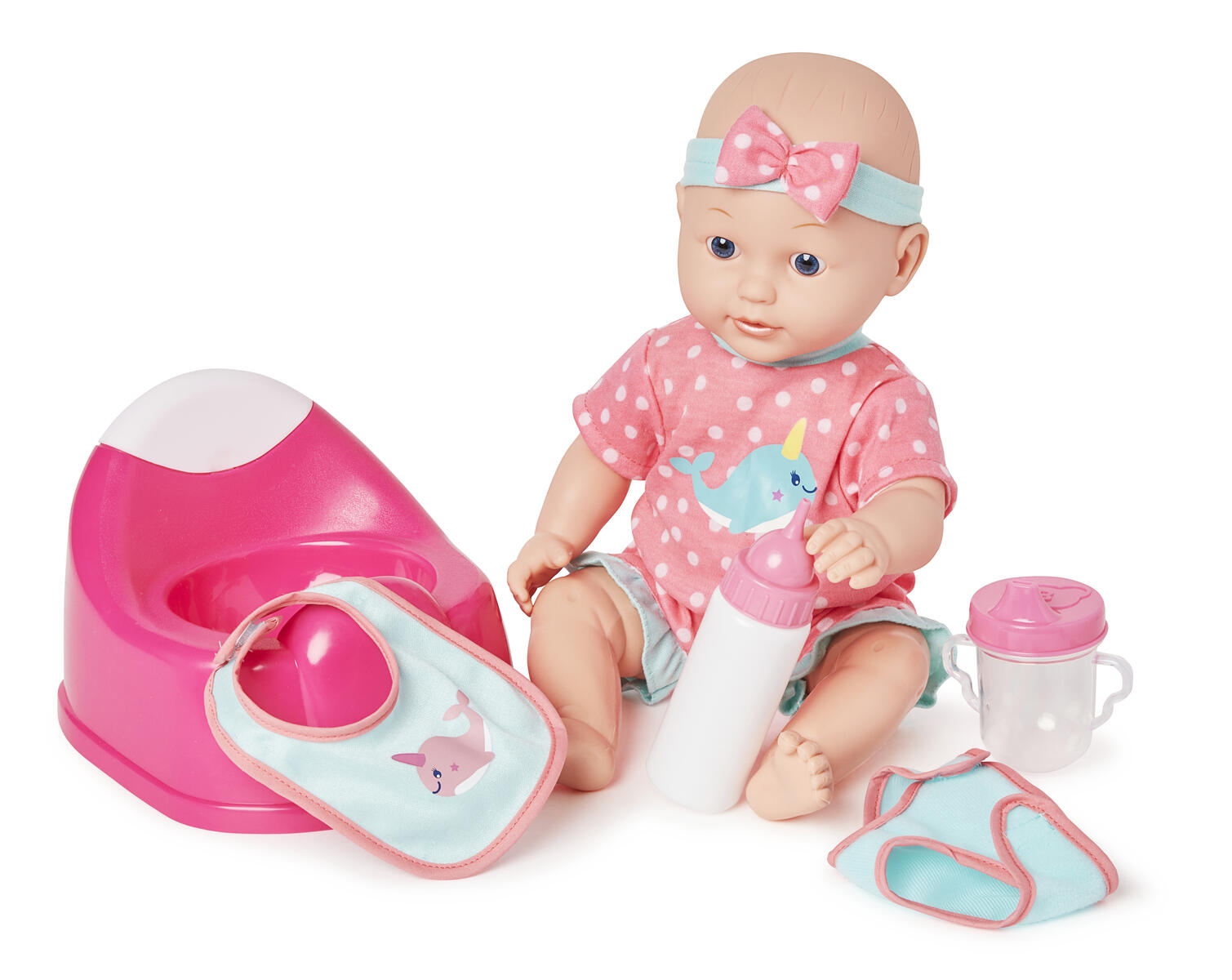 Docka med mjukstoppad kropp och blundögon. Längd 40 cm. Dockans armar, huvud och ben är tillverkade av PVC, utan förbjudna ftalater. Handtvätt. Från 2 år.